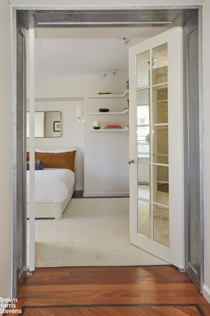 The crown jewel is the home's luxurious primary bedroom suite with custom designed wall-to-wall carpeting. The entrance is flanked with the finest craftsmanship in closets and built-ins, including a divinely proportioned 10'X9' dressing room closet. The truly spa-like bathroom includes separate glass-enclosed steam shower and toilet, together with double sinks with Samuel Heath faucets. The walls and floor are masterfully cut from whole Calacutta Gold marble slab. The second bedroom is large and can be accessed from either the bedroom hallway or from the living room through antique mirrored French doors. This bedroom has a quiet north exposure across the terrace. The en-suite windowed bathroom is perfectly tempered from its soaking tub to ultra-fine finishes. This apartment has abundant storage, a place to put all your treasures, and exceptional finishes; everything is well thought out.