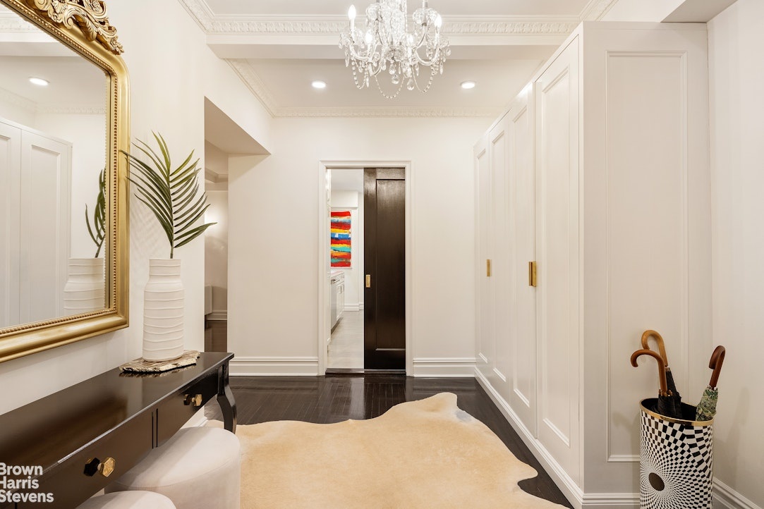 Apartment #6F, a spacious 2 bedroom, 2 bathroom home, is a sophisticated blend of classic prewar elegance with modern flair. The intricate moldings and high ceilings, gleaming ebonized hardwood floors, both elegant chandeliers and sleek modern lighting and baroque hardware all capture a sense of glamour. The oversized living room accommodates a dining area, the entrance foyer offers abundant storage with custom built-in cabinetry and two closets, and the windowed gourmet kitchen features a Miele washer/dryer and Thermador appliances. The extensive renovation resulted in many updated features and enhancements including the installation of through-the-wall heating/cooling units in all rooms. Apartment #6F is the perfect combination of stylish details, quality materials, and functionality.