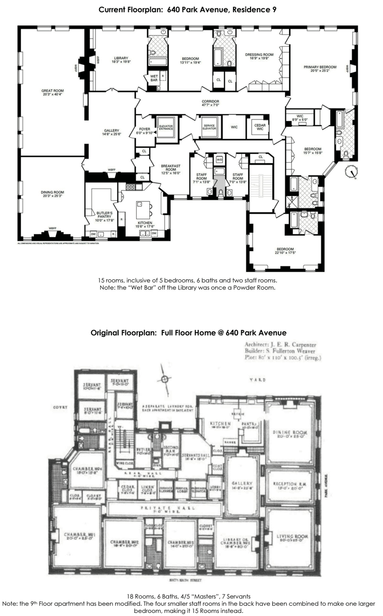 A century ago, The Real Estate Record & Guide, the industry rag of its day, wrote that architect J.E.R. Carpenter "was the father of the modern large apartment here in New York." Later Christopher Gray of The NYT wrote that, "In 1914 Mr. Carpenter designed, and again partly owned, the impressive 640 Park, at 66th Street. It is all limestone, with double sets of Florentine-style windows and one five-bedroom apartment per floor. This marked his arrival into the stratosphere of luxury apartments, with a separate gallery, reception room, wine closet and six servants' rooms, including a separate section for the butler and the 'second man.'"