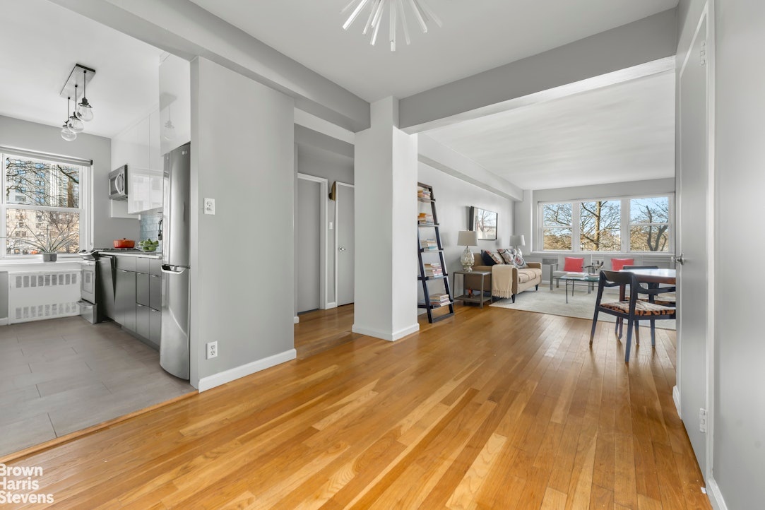 Immediately upon entry, enjoy the stellar views of Riverside Park! Being one flight up from the street, above the ground level apartments, is the perfect height to appreciate the beauty of the trees and observe the activity that makes Riverside Park so special. This renovated 2 bed 1 bath is conveniently - and privately - located on the lobby level of Schwab House, avoiding the need for elevators and with a ground level apartment directly beneath, this apartment is well above Riverside Drive, equivalent to the 2nd floor in both feel and park view. This corner home has sunny western and southern exposures with park and private garden views from every window. Enjoy a large living room, two spacious split bedrooms, a gracious entry gallery as well as a complete renovation and garden-facing windows in both the kitchen and hall bathroom. Five custom closets, through-wall air conditioning, hardwood strip flooring and ten new white windows complete this lovely home. Move right in and enjoy the Riverside Park views!
