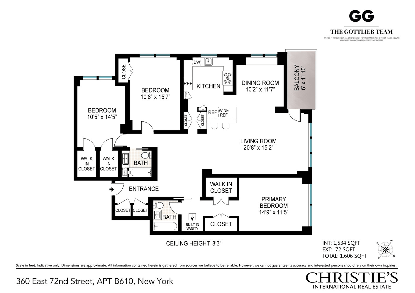 Interior square footage is approximately 1,534 square feet with an additional 72 square foot balcony for a total of approximately 1,606 square feet.