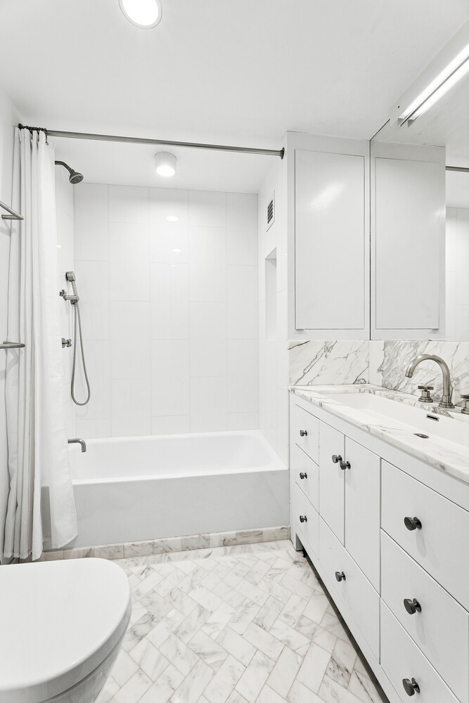 Both bathrooms feature House of Rohl fixtures with solid brass valves and rough ins, Duravit toilets, Kaldewei cast iron bathtubs, and radiant heated floors for added comfort. Closets throughout the home include automatic lighting.