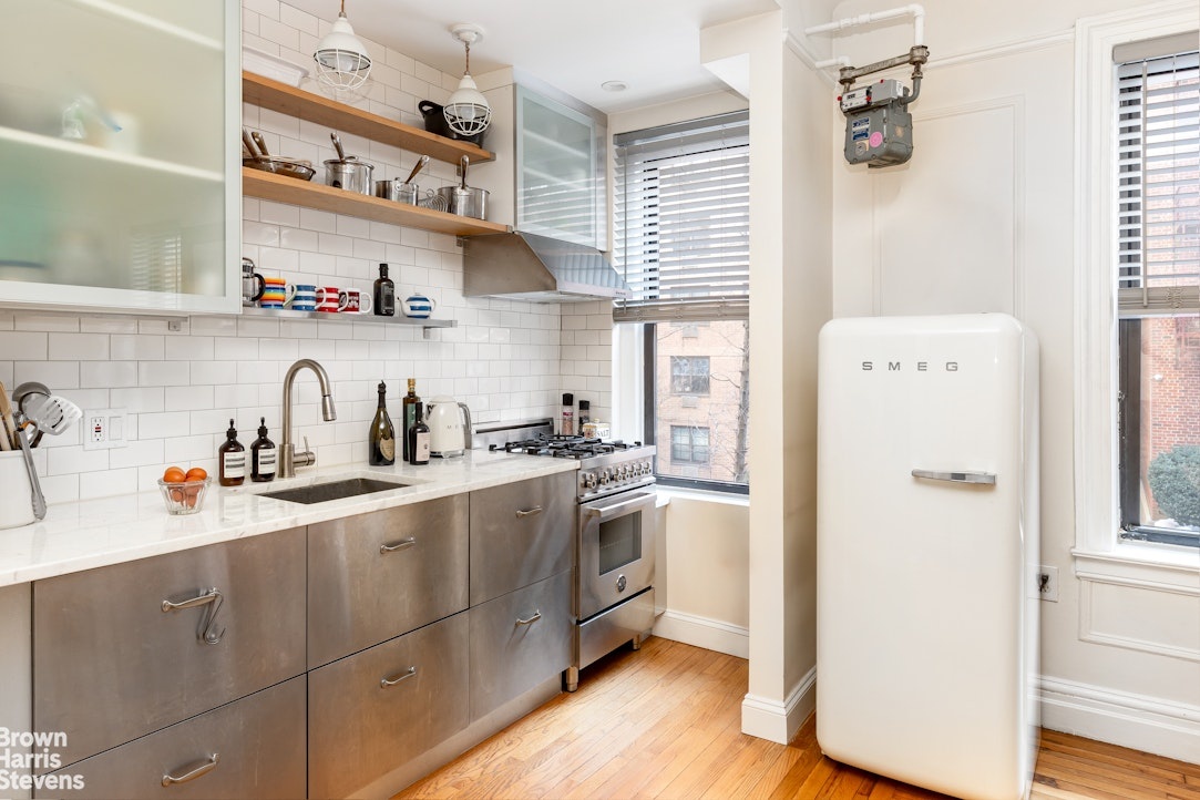 A kitchen to adore- marble countertops pair with a Bertazzoni four-burner gas range and a retro-style Smeg refrigerator, complemented by white subway tile backsplash, stainless steel drawer accents, and frosted glass upper cabinetry. Three recessed lights and two pendant fixtures provide inviting, and functional illumination.