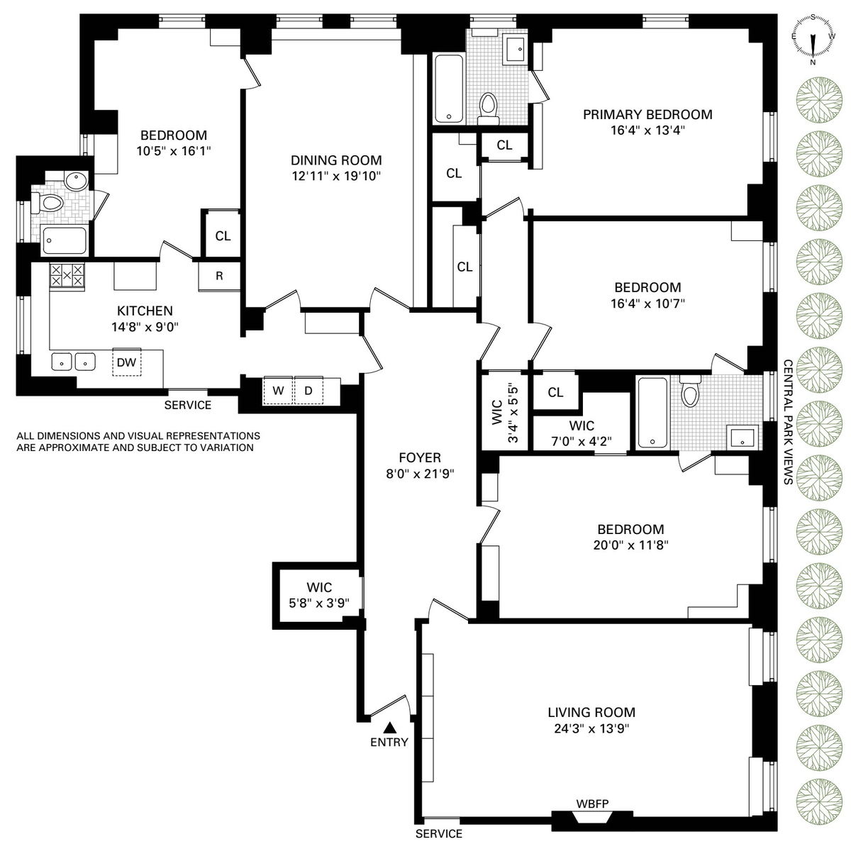 From the semi-private elevator vestibule, one enters the 22 foot long entrance gallery off of which the living room, dining room and three bedrooms emanate. The sun-flooded living room has two large windows facing the Park and a wood burning fireplace. The formal dining room faces South and can be used for both large scale entertaining and casual time at home. Also off the gallery, adjacent to the formal dining room, there is a Butler's pantry with a new washer/dryer, eat-in kitchen and a large fourth bedroom with its own bathroom. There are high ceilings and hardwood floors through out.