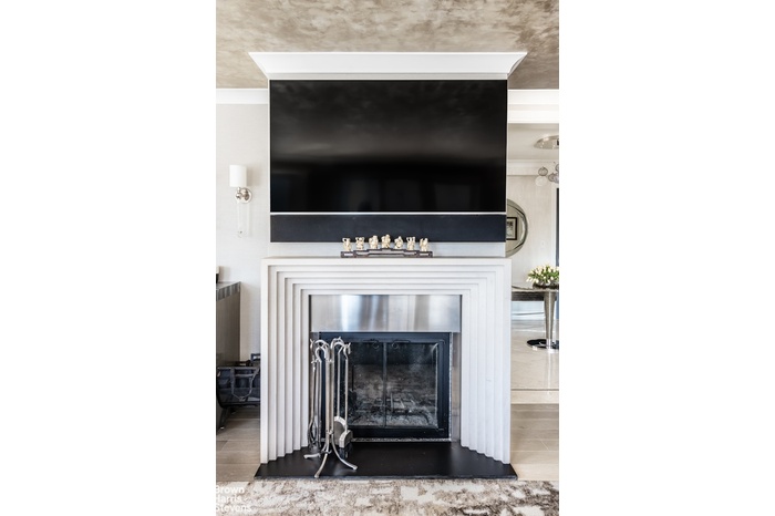Enter off of a semi-private renovated landing and be welcomed into a gracious square foyer wrapped in lime-wash textured walls with coved crown molding overhead. The floors are dressed in neutral marble with inlay, warmed by sunlight streaming in from a glorious corner living room. Enveloped in oversized wall-to-wall windows, the living room faces East and South offering grand entertaining space anchored by a central wood-burning fireplace with a handsome stepped limestone mantle and luxuriously expanded by two sizable terraces in both directions. The adjacent South-facing library is adorned with gorgeous custom millwork, textured wallpaper and customized inlaid tapestry.