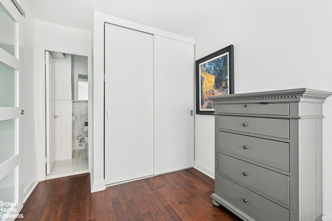 The home opens into a bright and expansive living and dining area, accented by sleek espresso wide-plank floors and oversized windows that frame the New York skyline. Just off the entry, a large walk-in closet provides exceptional storage. The renovated kitchen blends style and function with modern cabinetry, stainless steel appliances (Dishwasher, Microwave, Gas Range and Full Size Refrigerator), and generous counter space.