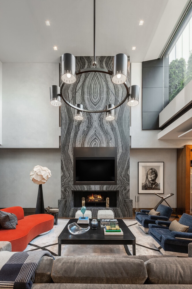 A formal dining room with oversized sash windows and striking herringbone floors offers an elegant setting for entertaining. The dramatic great room showcases soaring 18-foot ceilings and a bold marble-clad wood-burning fireplace, creating an exceptional sense of scale and volume. The chef's kitchen is outfitted with pristine marble countertops and top-of-the-line stainless steel appliances.