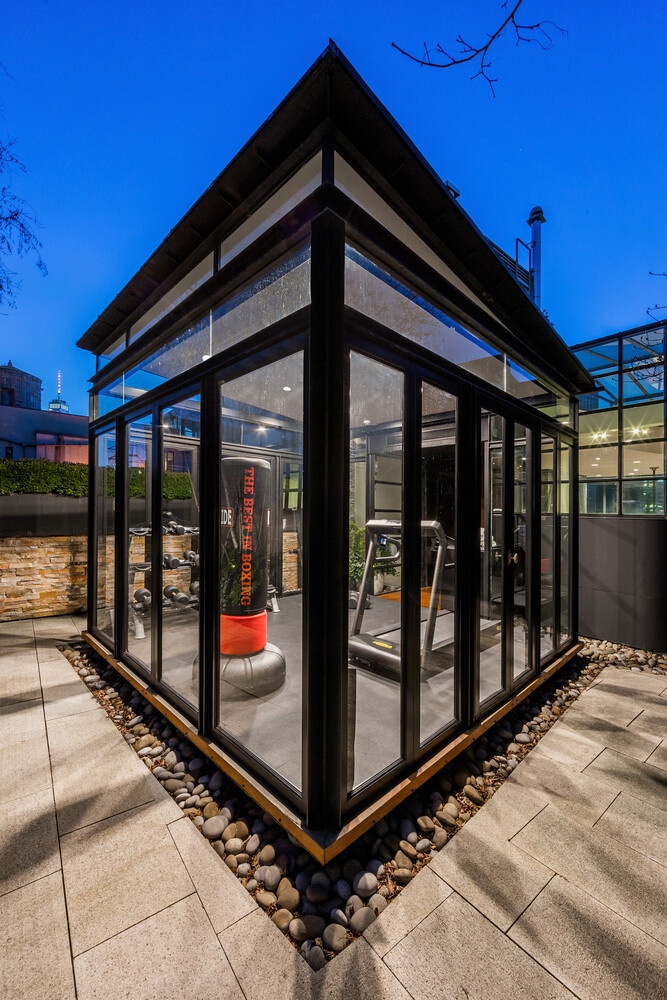 The South Penthouse at 459 West Broadway is a meticulously reimagined four-bedroom residence with a glass-enclosed private gym, four-and-a-half bathrooms, low monthly costs, multiple wood-burning fireplaces, and an extraordinary rooftop retreat featuring a hot tub, outdoor kitchen, and open-air cinema. Ideally located just above Prince Street in the heart of north SoHo-steps from Sadelle's-a keyed elevator opens directly into this custom-designed duplex penthouse.