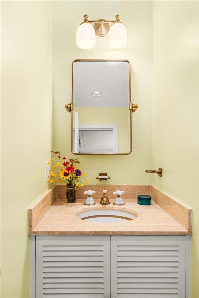 Stylish folding doors reveal a king-size primary suite with a wall of custom built-ins, a lovely wall niche, and a pair of deep reach-in closets. The second bedroom, or home office, has a huge reach-in closet and casement windows, and both bedrooms have access to a windowed Jack-and-Jill bathroom with separate powder rooms and a deep soaking tub. The home has central air and an in-unit washer and dryer.
