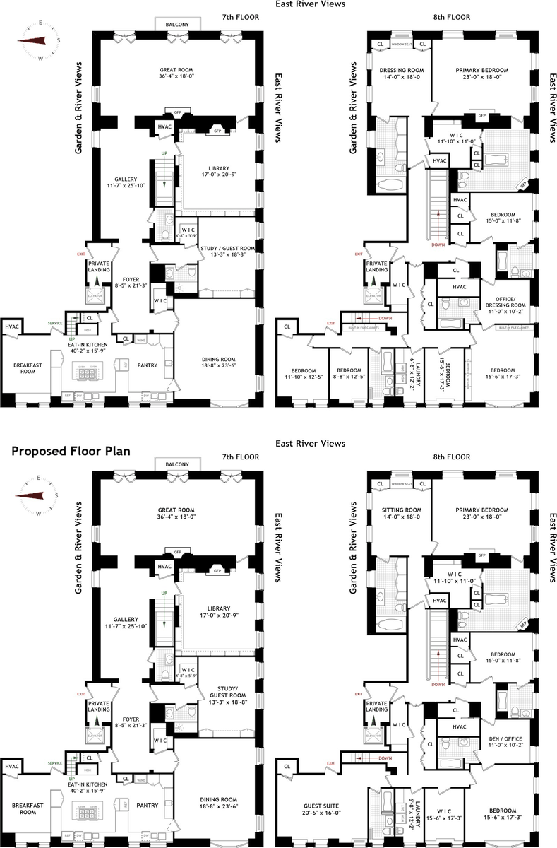 From the extra wide and elegant staircase up to the bedroom floor, the entire primary suite encompasses the side of the apartment overlooking the East River. The corner primary bedroom suite is enormous with its own sitting room, multiple walk-in closets, and two fully windowed bathrooms. The rest of the 8th floor consists of three bedrooms, a yoga room, laundry room and then the former staff quarters which could be another large bedroom suite for guests.