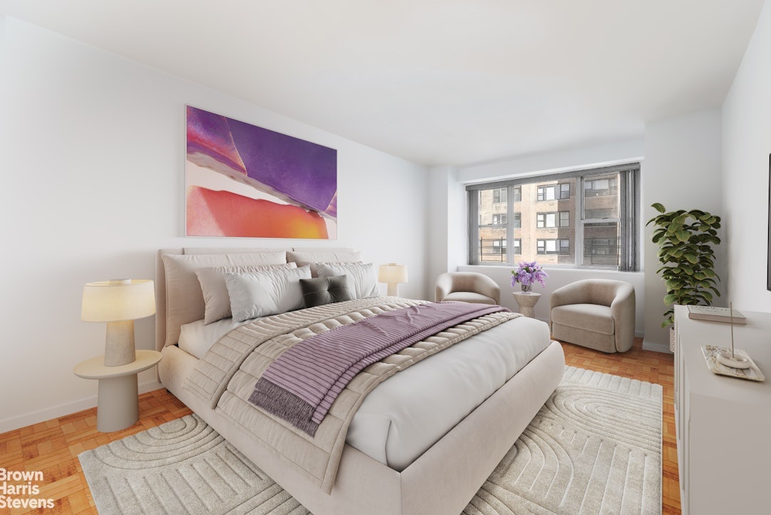 Wonderful New Opportunity at THE CHURCHILL. Welcome to this charming Converted 2-bedroom home, where timeless character meets cozy living. The oversized master bedroom offers a spacious and serene retreat, providing a comfortable and inviting atmosphere, while the second bedroom benefits from eastern exposure, bringing in plenty of natural light. The airy ambiance enhances the sense of space, making every corner of this home feel warm and inviting.At the heart of the residence, a windowed L-shaped kitchen offers both functionality and style, providing an ideal setting for culinary creativity. The bathroom is designed for privacy and convenience, with a well-planned separation between the bath and vanity area. Thoughtfully placed closets ensure ample storage while maintaining aesthetic appeal. The expansive 33-foot-long living and dining area is perfect for entertaining, offering a versatile space for gatherings or quiet evenings at home. Whether you are hosting friends or unwinding after a long day, this living area sets the perfect stage for relaxation and connection.