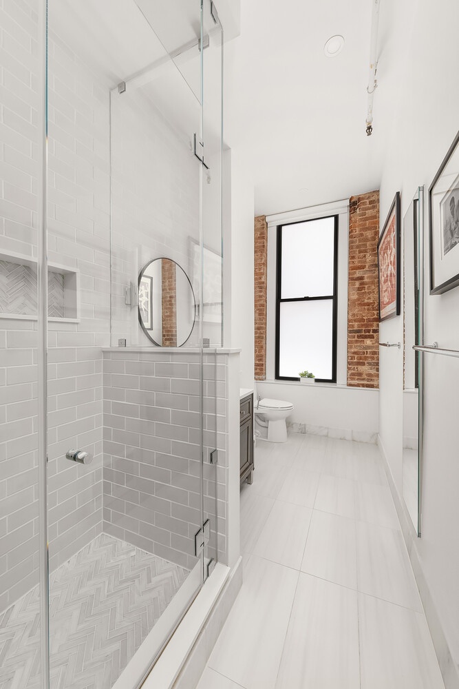 The oversized primary suite is pin-drop quiet and boasts a full wall of custom California closets. The spa-like bathroom features exposed brick, quartz vanity, and a huge walk-in shower with marble and subway tiling.