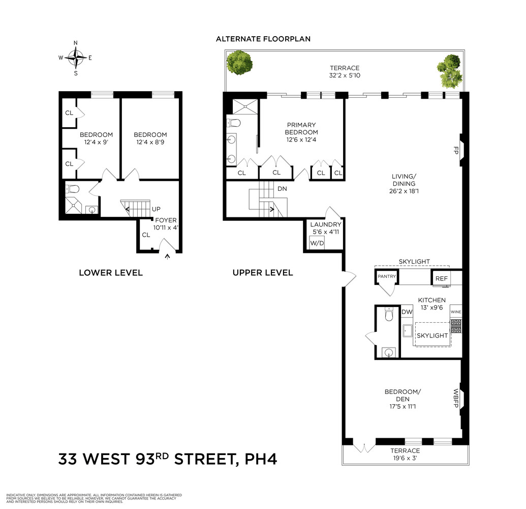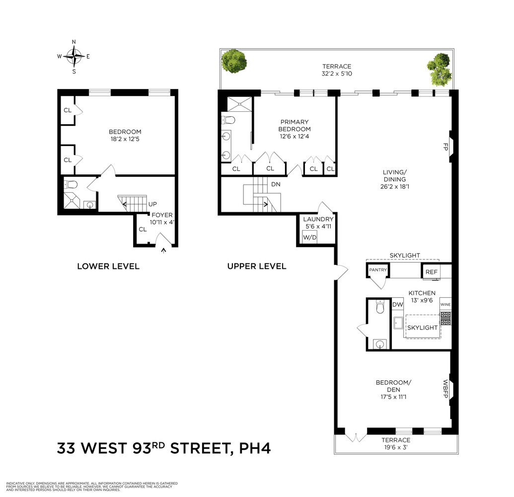 The upper level enjoys a striking living and dining space with 13-foot cathedral ceilings, bleached white oak hardwood floors, and a fireplace. South-facing skylights bathe the space in natural light, while floor-to-ceiling, north-facing glass doors open directly onto a private terrace overlooking charming 94th Street townhouses and a serene, landscaped communal garden below-an ideal setting for entertaining or quiet relaxation.