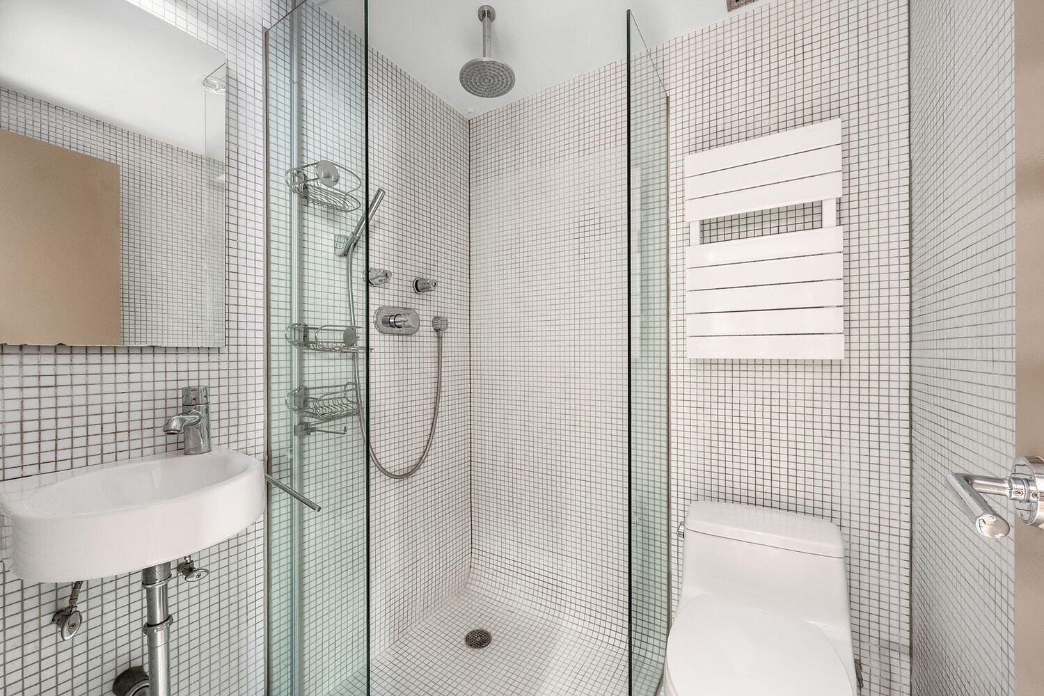 Just off the living area is the primary bedroom suite, featuring abundant custom storage, a ceiling fan, direct terrace access, and a beautifully appointed en-suite bathroom with handmade tile with modern shower stall, a walnut double vanity, and a dual-flush in-wall toilet.