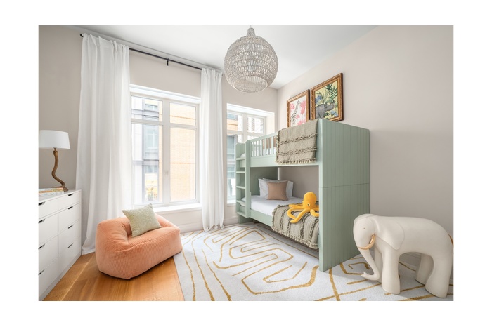The bedroom wing features 7" white oak plank flooring throughout. The spacious primary suite offers two oversized closets and a luxurious windowed 5-fixture bath with Bianco Oro marble slab walls and radiant-heated floors, a limed oak millwork vanity, custom medicine cabinets and lighting by Kelly Behun Studio, and Waterworks fixtures in burnished nickel.