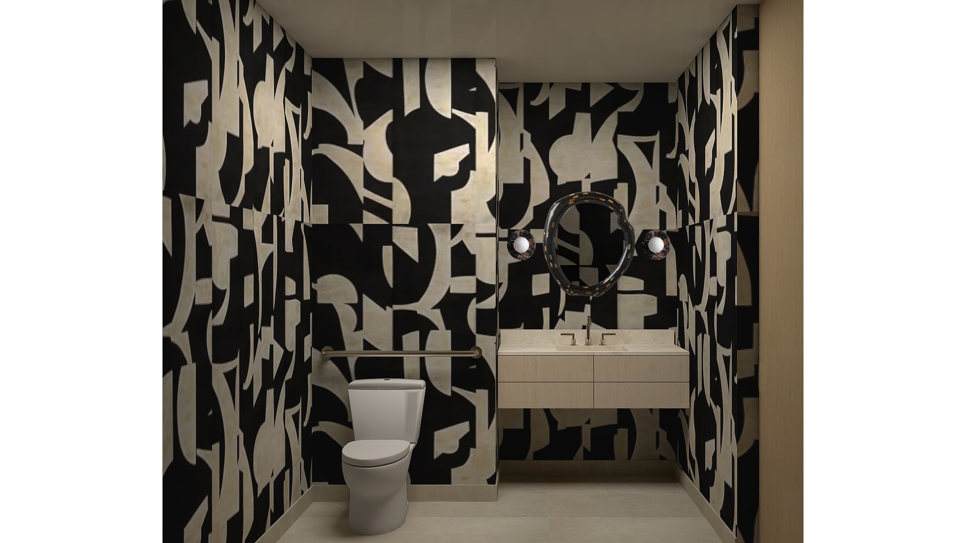 The powder room makes a striking impression with honed Italian Burlesque marble slab floors and wainscot, a matching marble sink and countertop, and Waterworks burnished nickel fixtures. A brass-framed arched mirror and aged brass pendant sconce complete the design.