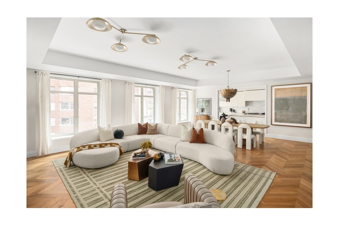 The Fourth Floor at 1228 Madison Avenue is a 4-bedroom, 3.5-bath full-floor home spanning 3,136 ft (291 m), with desirable east and west exposures. A private elevator vestibule leads to a dramatic 8' white oak entry door, opening into an elegant foyer with custom-stained white oak flooring in a chevron pattern. This distinctive flooring continues through the main living spaces, culminating in a nearly 30' great room bathed in natural light from five oversized windows overlooking Madison Avenue.
