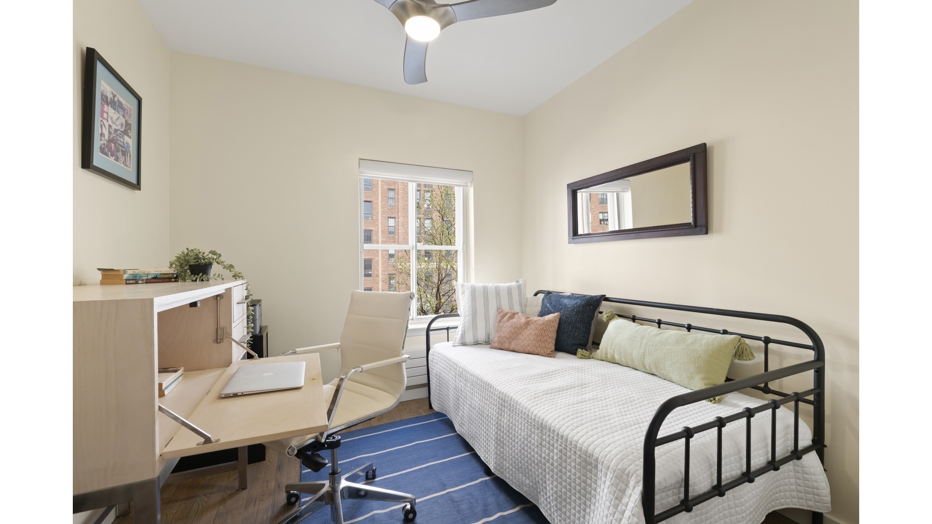 Up the interior wood staircase, the mood shifts to quiet retreat. The primary suite offers a walk in wardrobe and a spa worthy bath with dual sinks and refined finishes. A second bedroom, with barn style closet doors and nearby washer dryer, sits beside another full bath complete with a deep soaking tub. Soundproof windows and ceiling fans ensure calm; the entire floor feels hushed, composed, deeply livable.