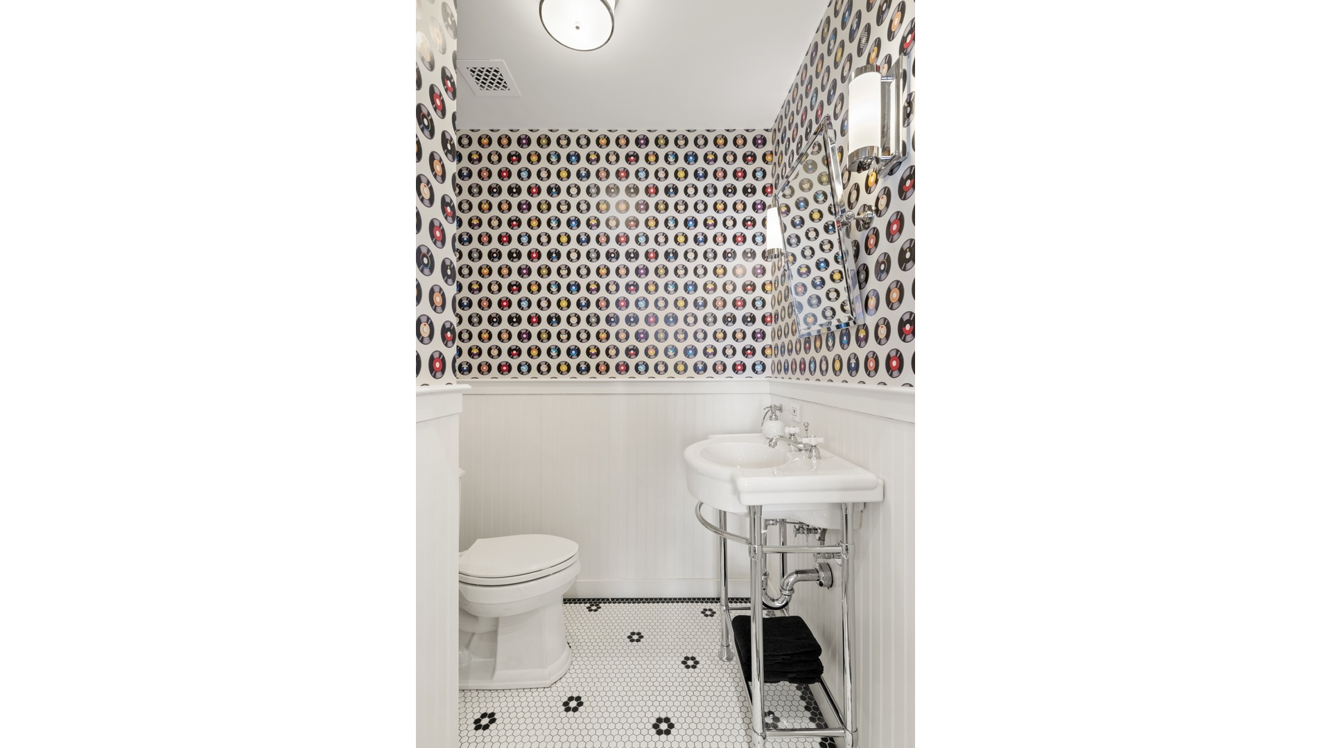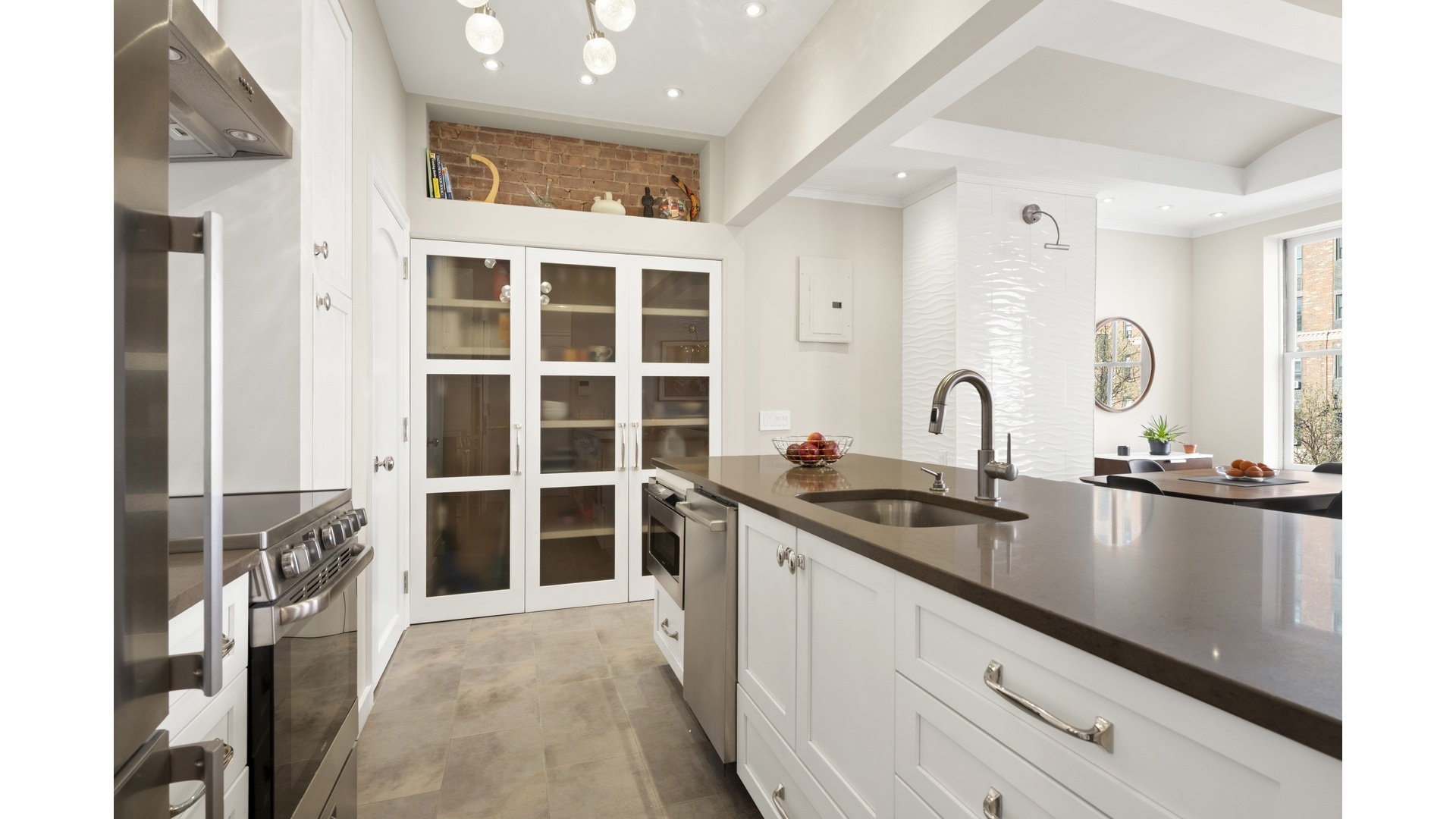 Built in cabinetry lines the space with purpose and restraint, concealing a wine refrigerator and thoughtful storage that never interrupts the serenity. The dining area sits comfortably beside a kitchen that reads like a modern atelier. A generous island centers the room, glass paned pantry doors glint softly in the light. Even the powder room, tucked discreetly behind the kitchen, carries the poetry forward with classic penny tile underfoot.