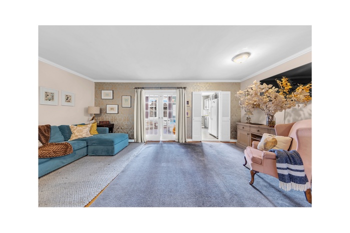 A gracious foyer with an oversized double closet leads into a living and dining area that is bathed in warm light. Oversized windows, high ceilings, and hardwood floors create an airy, inviting atmosphere, while the generous proportions allow for effortless entertaining, working from home, or simply stretching out and enjoying the space. Elegant French doors open from the living area to the thoughtfully converted second bedroom - offering flexibility while maintaining flow and light.