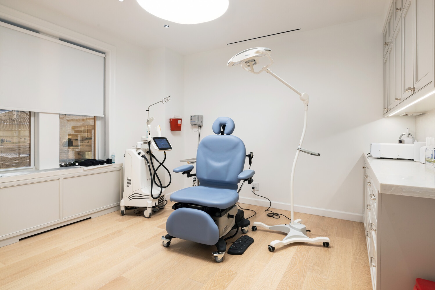 There is a windowed and elegant waiting/reception area fronting Park Avenue with a beautiful, windowed marble powder room. There is a private consulting office, with a wall of custom Mahagony built-ins fronting Park Avenue, 4 exam rooms, 1 larger procedure room, lab, business area, discharge station, and another powder room for the staff. This meticulously designed office offers great flow and along with the abundance of architectural recessed and overhead lighting, creates an inviting ambiance which is conductive to patient comfort.