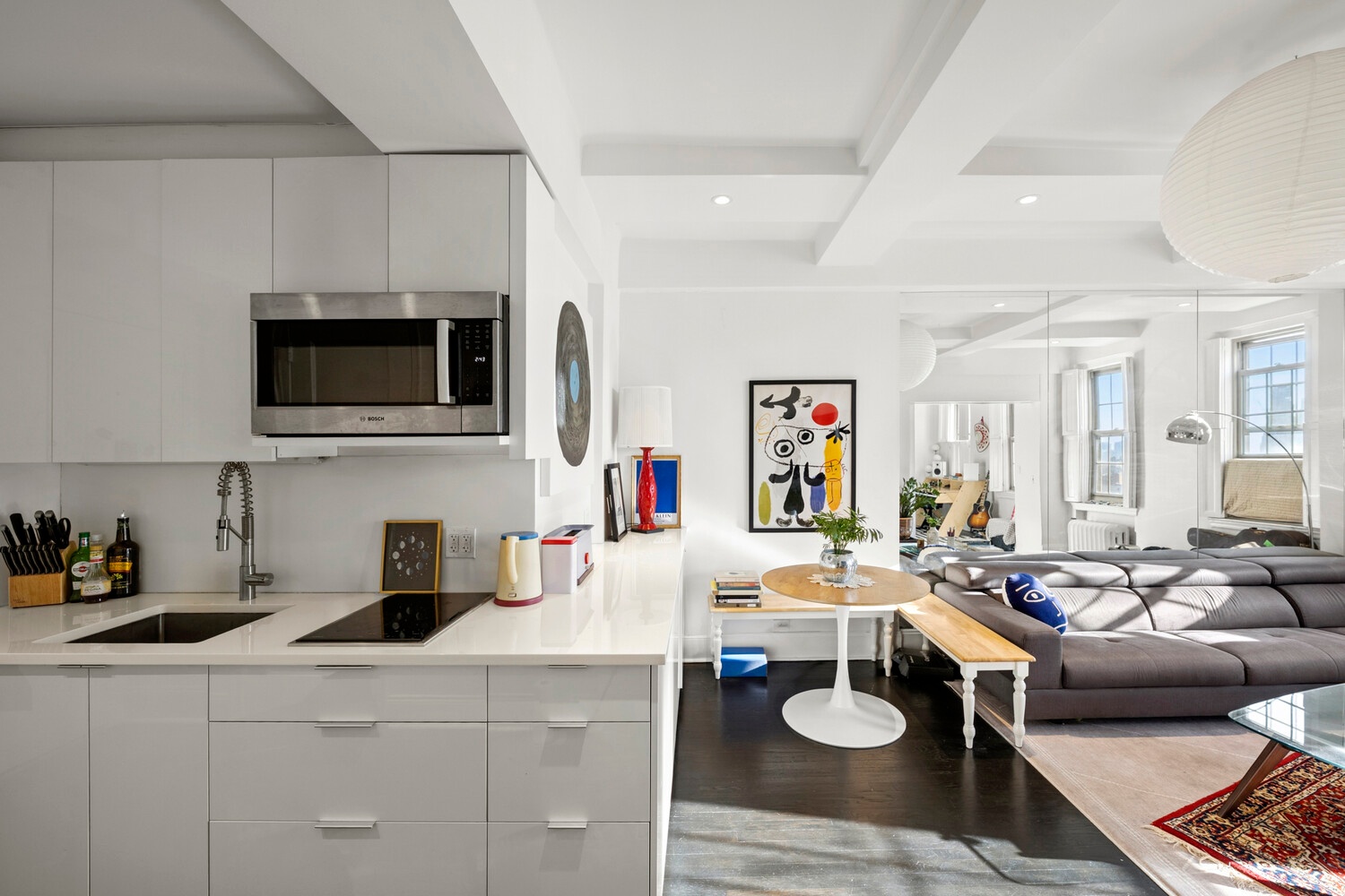 Thoughtfully renovated from top to bottom, this oversized one-bedroom, one-bath home is in true move-in condition and works equally well as a full-time residence or a refined pied-à-terre. The layout has been smartly reimagined to maximize both light and flow, with custom double pocket doors that open the bedroom to the full span of nearly 24 feet of windows-creating a dramatic sense of space when fully open, while still offering privacy when desired.