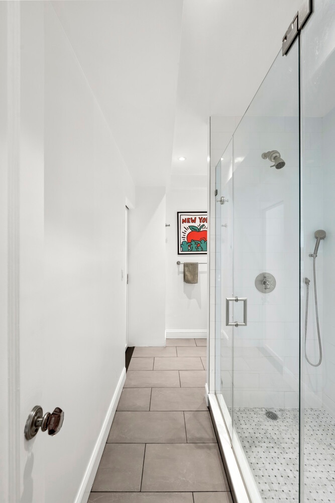 The expanded kitchen features sleek custom cabinetry with generous storage, stainless steel appliances, and Caesarstone countertops-designed for both functionality and style. The bathroom has been significantly enlarged and finished as a spa-like retreat, complete with a large walk-in shower and elegant modern details. Dual pocket doors allow the bath to function as an en-suite or be accessed separately for guests.