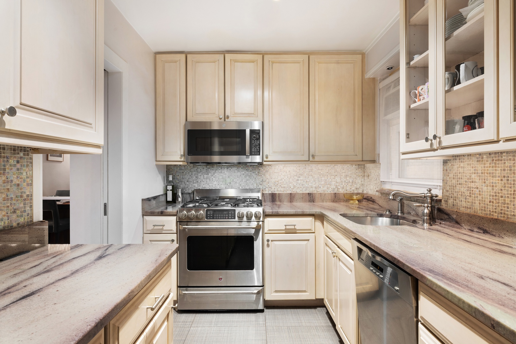 The windowed chef's kitchen is outfitted with premium appliances, including a Miele dishwasher and Sub-Zero refrigerator, along with generous cabinetry and ample workspace.