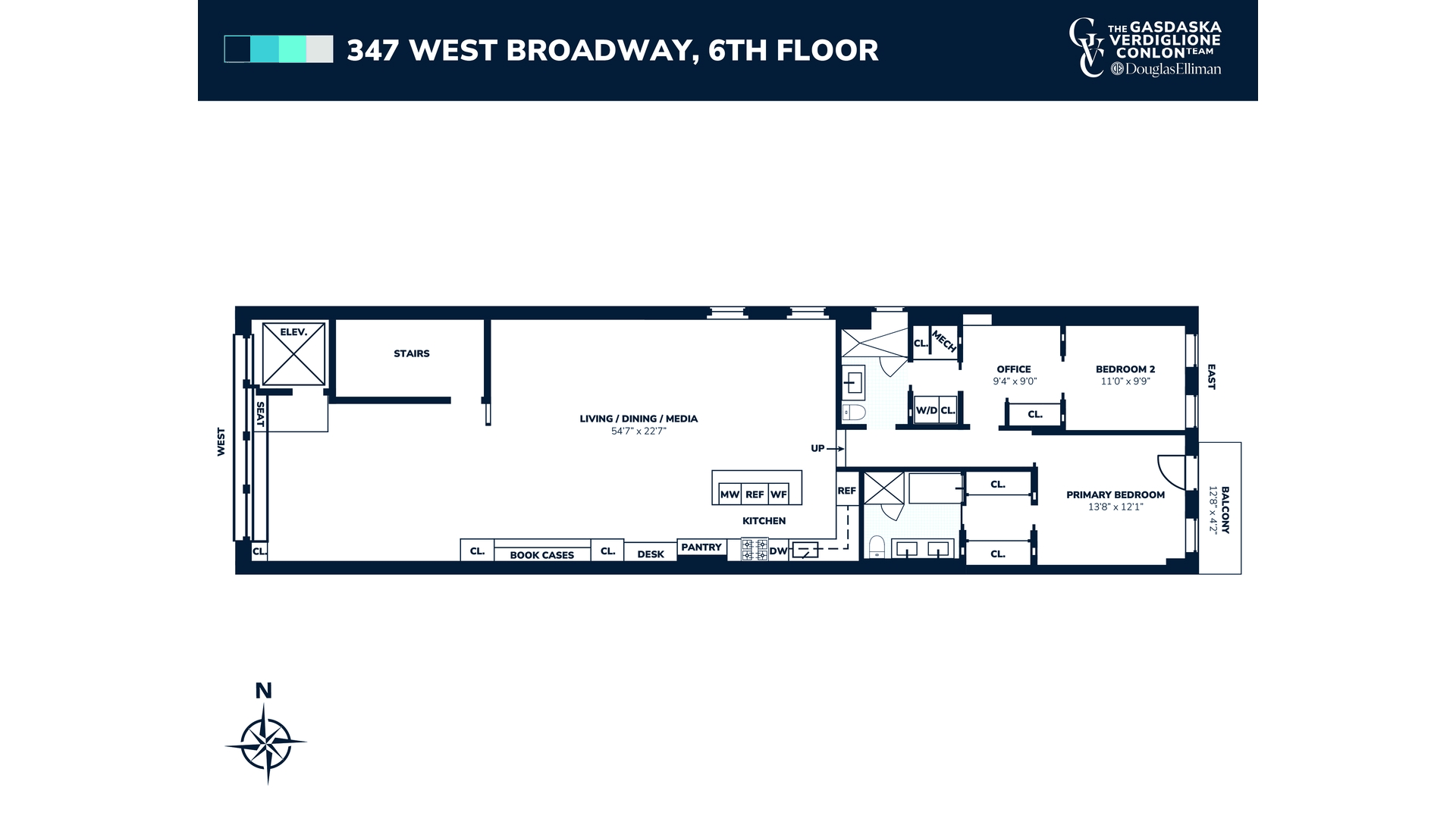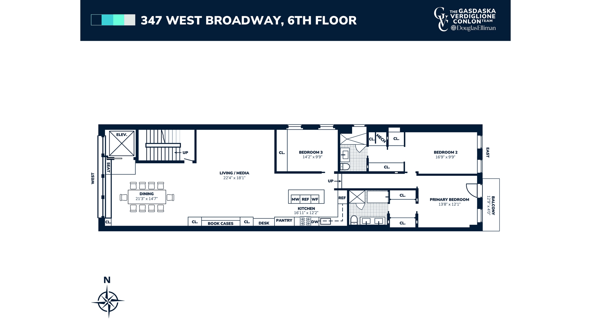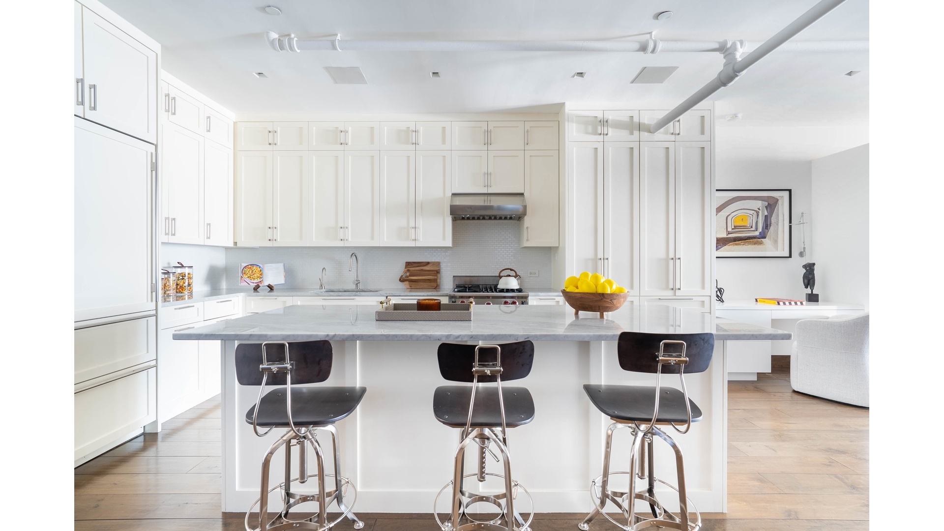 Take the elevator up and arrive directly home. This approximately 2,200 square foot full floor loft at 347 West Broadway pairs authentic SoHo character with a complete renovation that has been meticulously cared for. Key locked elevator entry opens into a dramatic great room where exposed brick, wide plank floors, and high ceilings frame a wall of oversized double-glazed windows. The layout is built for both hosting and daily ease. A large living and dining expanse flows into a sleek open kitchen, anchored by a substantial island and finished with Carrara marble, custom cabinetry, and a curated suite of appliances. Highlights include a Sub-Zero refrigerator with double freezer drawers, a Wolf range vented to the exterior, and a dedicated 50 bottle Sub Zero wine fridge.
