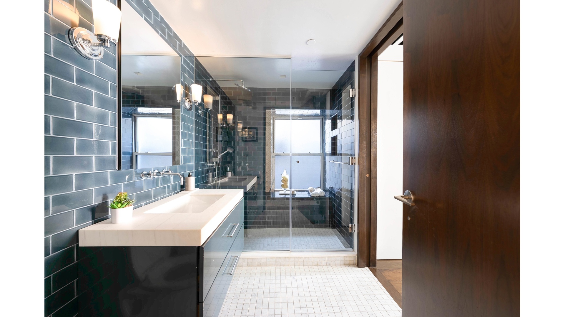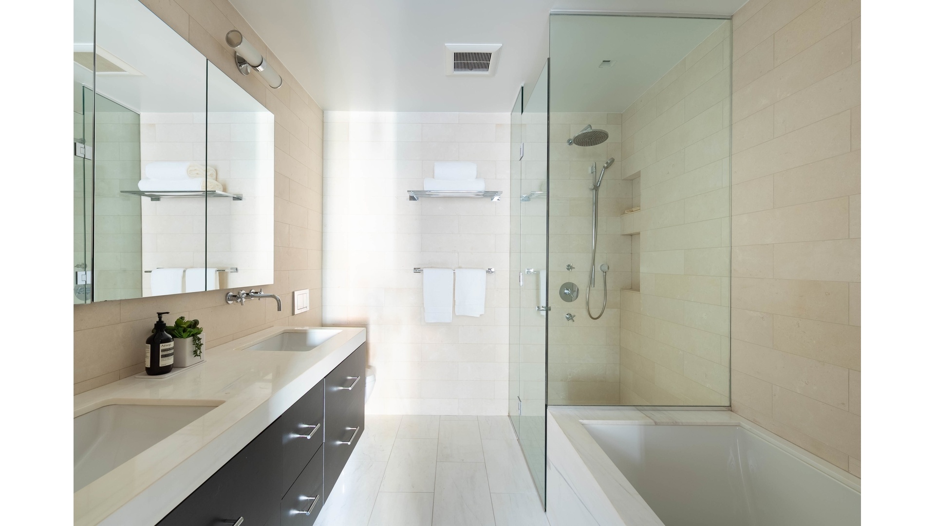 Storage and utility are integrated with intention, from tailored closets to custom built ins and a dedicated desk area that fits today's work from home rhythm. A gallery like corridor creates separation and quiet, leading to two bedrooms, a den/office, and two spa finished baths. The primary suite offers morning light, a private balcony, and generous custom closets. The en suite bath is a calming, design rich retreat with floor to ceiling limestone, double sinks, a deep soaking tub, a glass enclosed rain shower, and radiant heated floors. The guest bath continues the same standard with hand glazed tile, a custom vanity, a rain shower, and radiant heat.