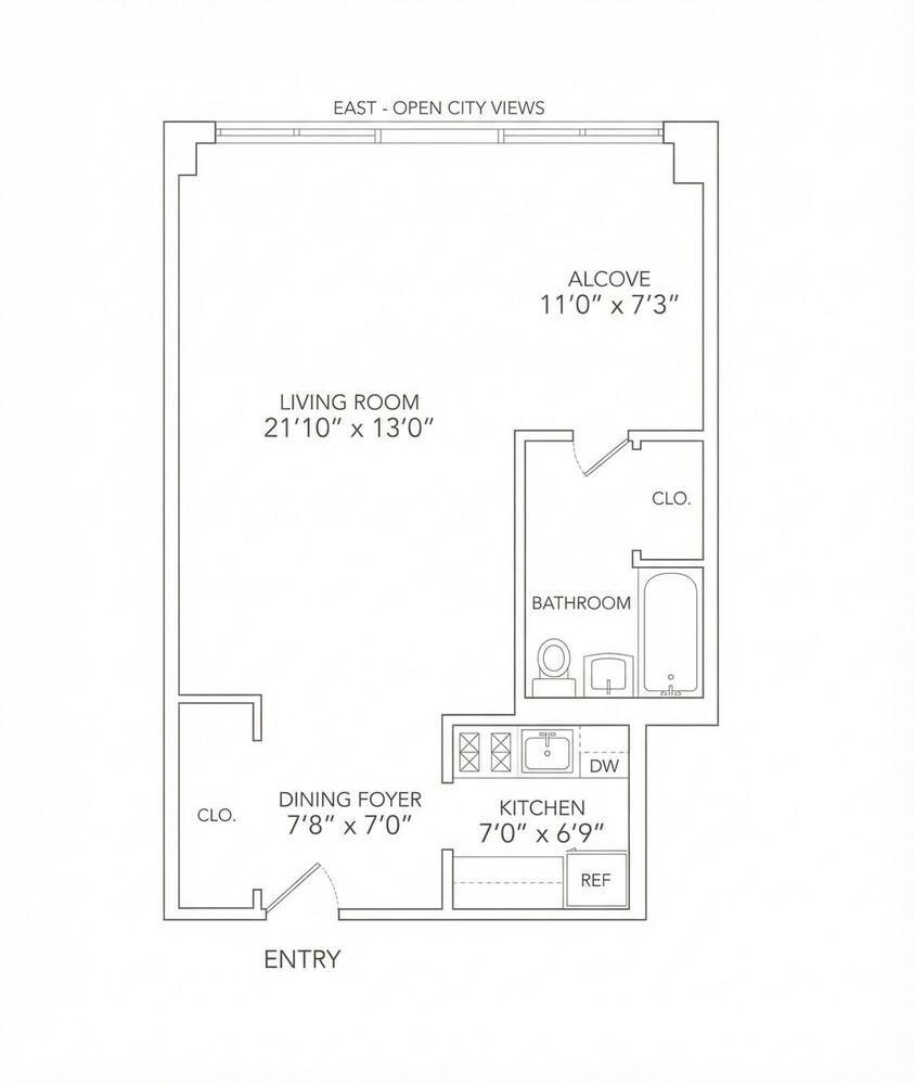 The thoughtfully designed layout accommodates distinct living, dining, and sleeping areas, providing the comfort and flexibility of a true one-bedroom feel. A generous sleeping alcove, ample closet space, and sleek white flooring enhance both flow and storage.