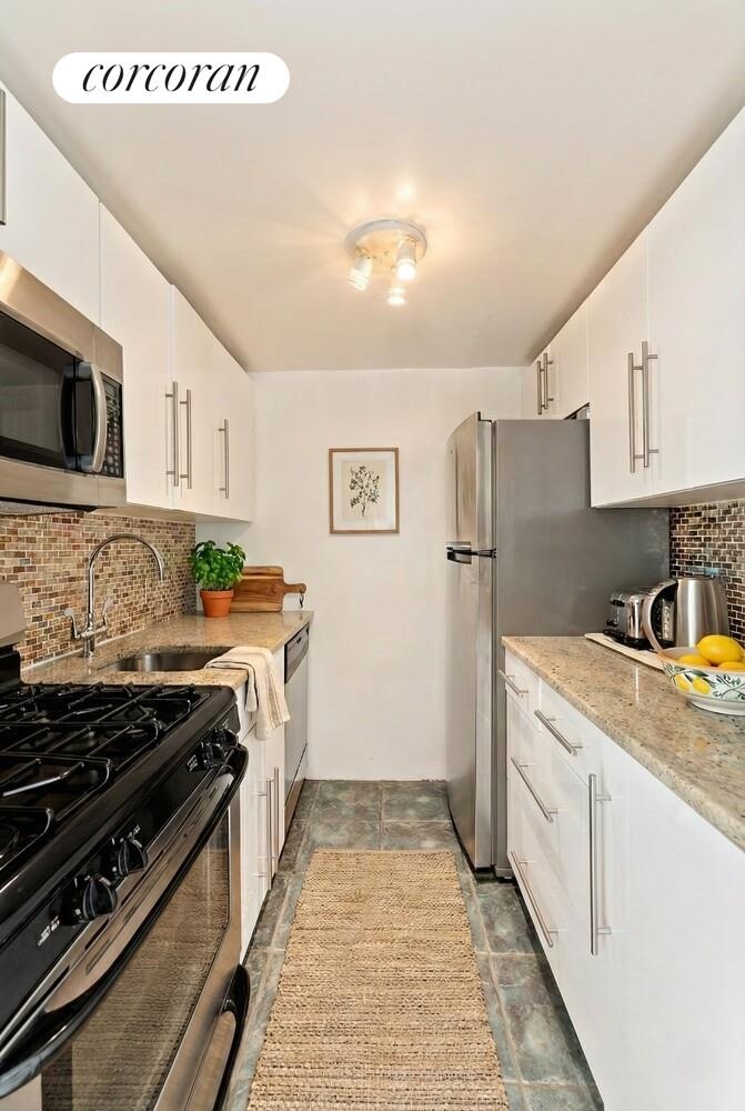 The chef's kitchen is outfitted with stainless steel appliances, white lacquer cabinetry, and modern finishes, ideal for both everyday living and entertaining. The bathroom features a deep soaking tub, creating a serene retreat at the end of the day. Window treatments are already installed, allowing for a seamless move-in experience.
