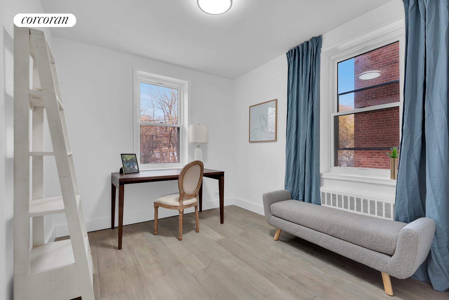 Rounding out the picture are your king and queen size bedrooms with great closets, powder room, western exposure, living room big enough to accommodate a dining area, skim-coated walls, updated electric and restored original details.
