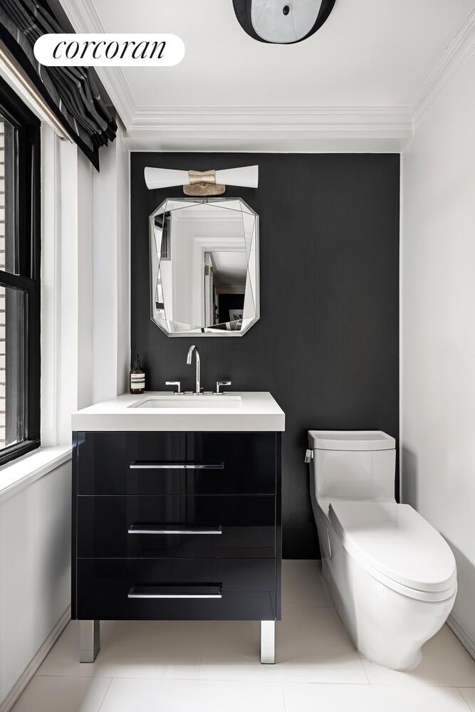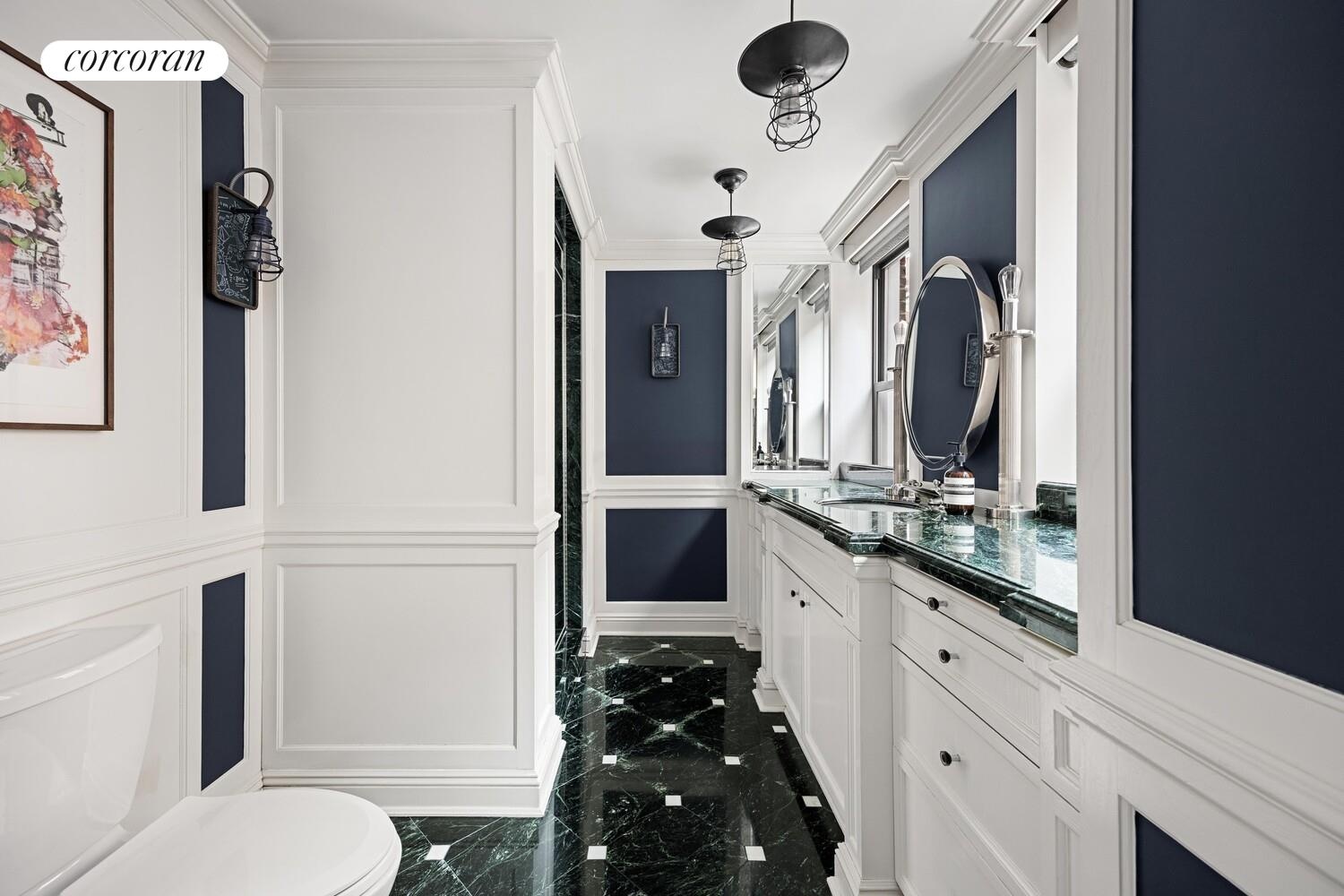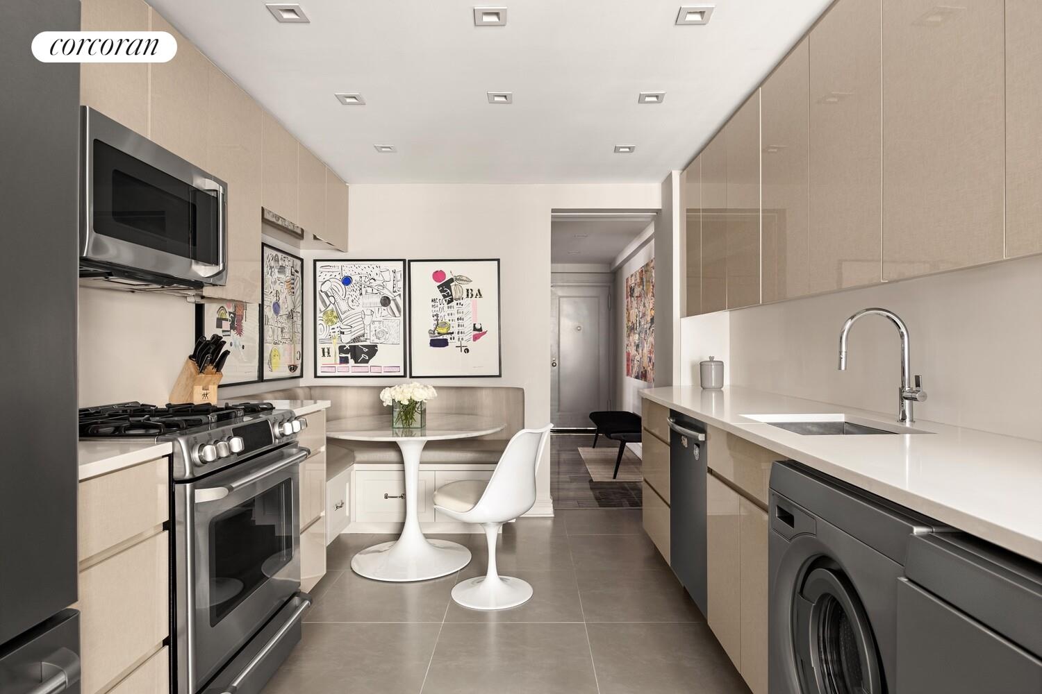 The inviting eat-in kitchen has been fully renovated with sleek lacquered cabinetry, stainless steel appliances, white stone countertops and a built-in banquette. Accessible from both the kitchen and the foyer, the formal dining room is the perfect spot for dinner parties. In addition to two cavernous living spaces, there is also a dedicated home office area with built-in desks and another huge walk-in closet.