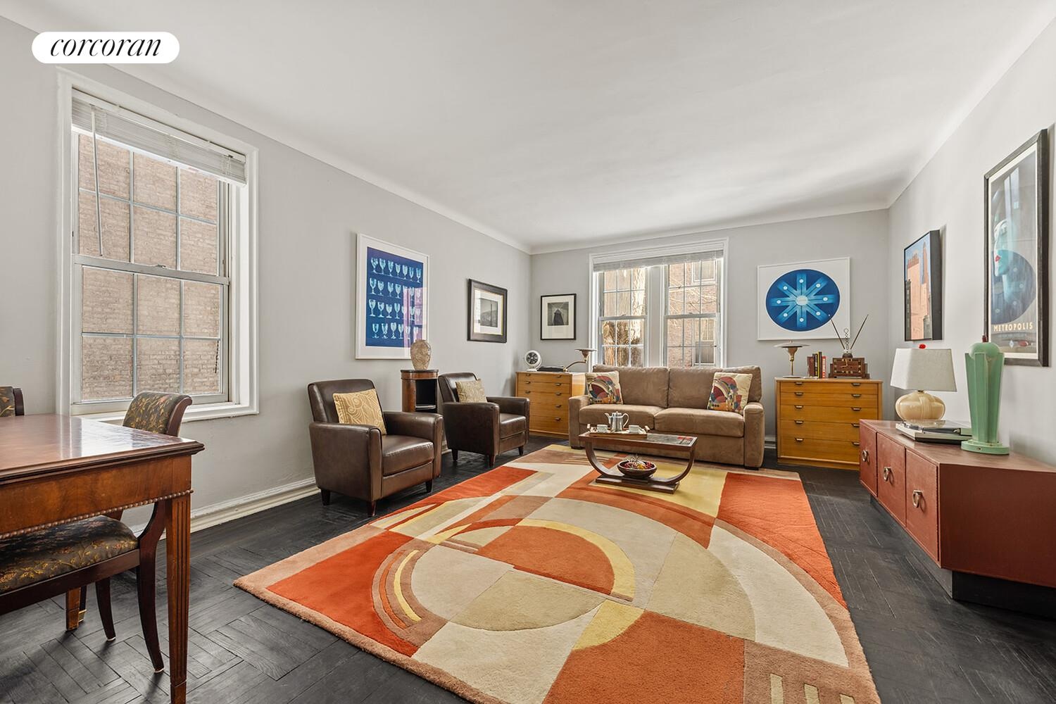 Set above street level with two exposures on to the tranquil courtyard, this home retains its pre-war charm and detail throughout. You enter into a foyer with room for a sitting area and access to three spacious closets. One of the architectural details is the foyer's archway, which leads to the extra-large living room, featuring two windows and two exposures plus ample space for living, dining and sleeping. The vintage kitchen also has two windows and is large enough to enjoy cooking and baking comfortably. The bathroom boasts the original 1920s tile work as well as another window!