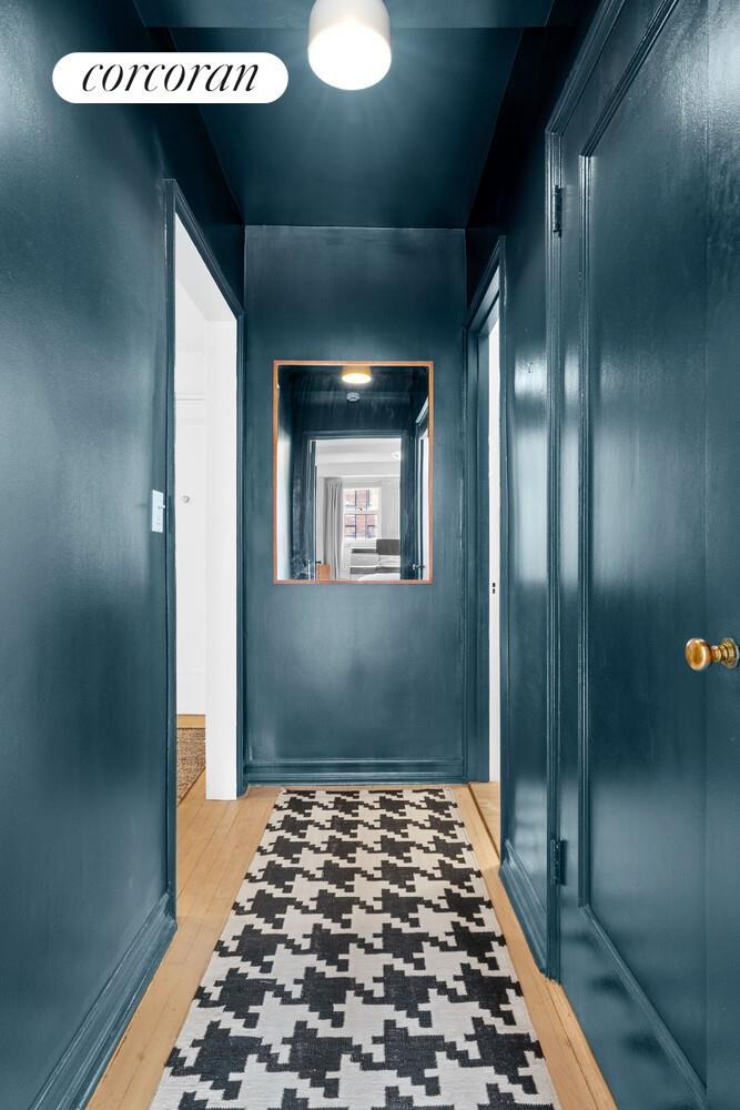 The sunny south-facing bedroom enjoys two large windows that bathe the room in natural light and features a walk-in closet, part of the apartment’s exceptional storage.