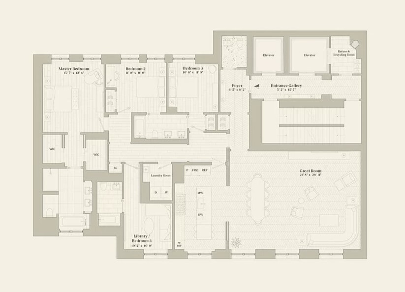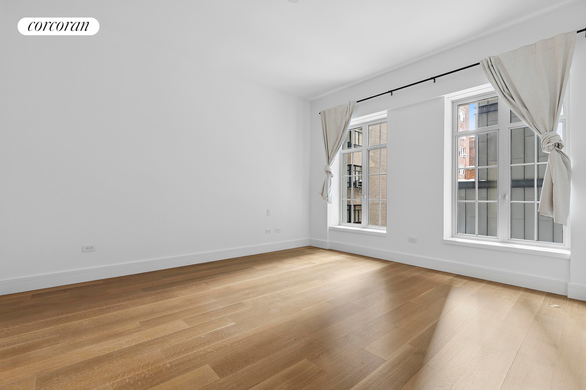 Welcome to Residence 3 at 1228 Madison Avenue, a luxurious 3,136 square foot home that combines the elegance of a cooperative with the flexibility of condo rules. This exquisite 4-bedroom, 3.5-bathroom residence offers grand proportions and sophisticated design elements throughout. Enter through a private elevator vestibule into a space adorned with custom stained white oak chevron flooring. The expansive living room, with its commanding views over Madison Avenue, provides an ideal setting for both relaxation and entertaining.