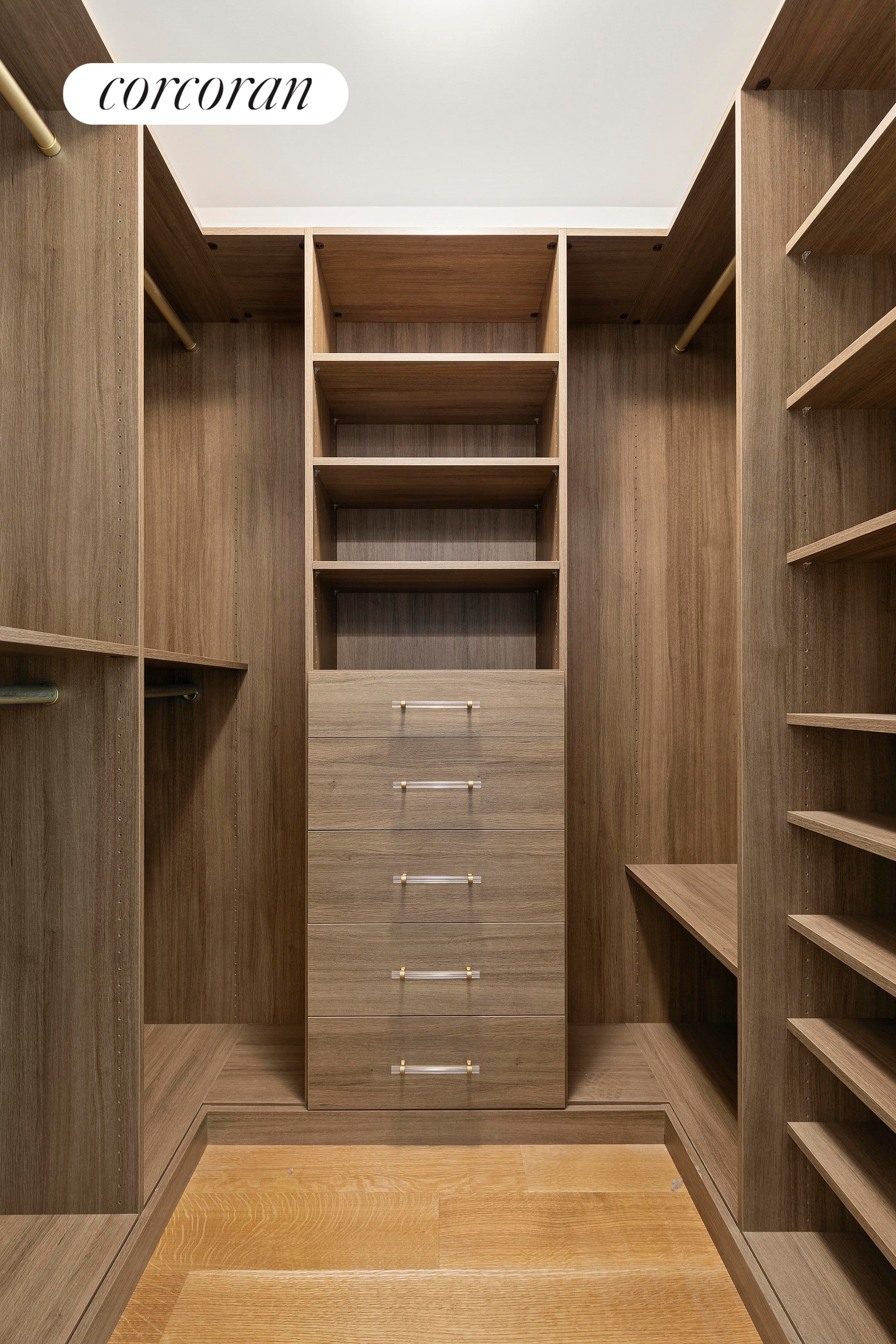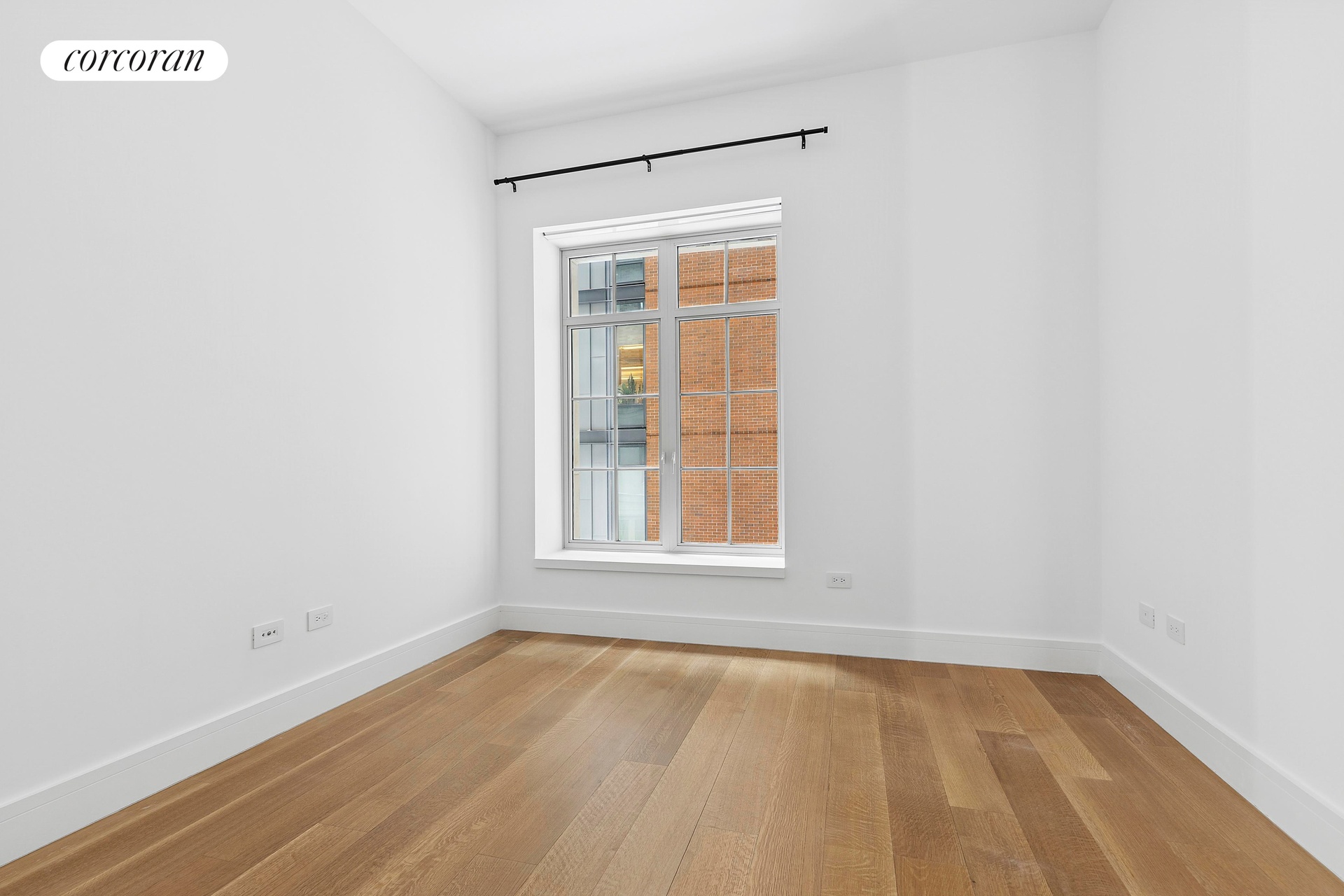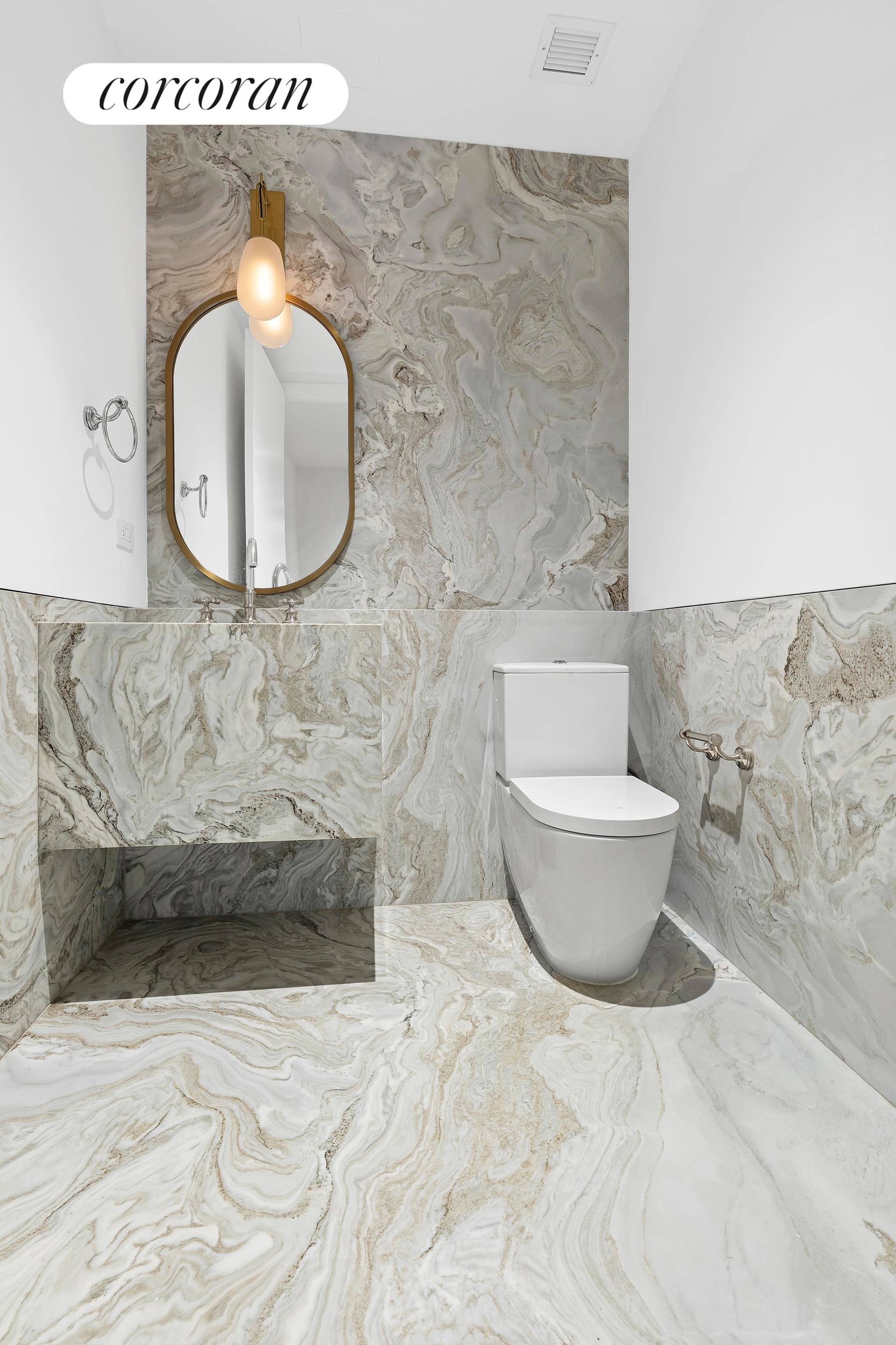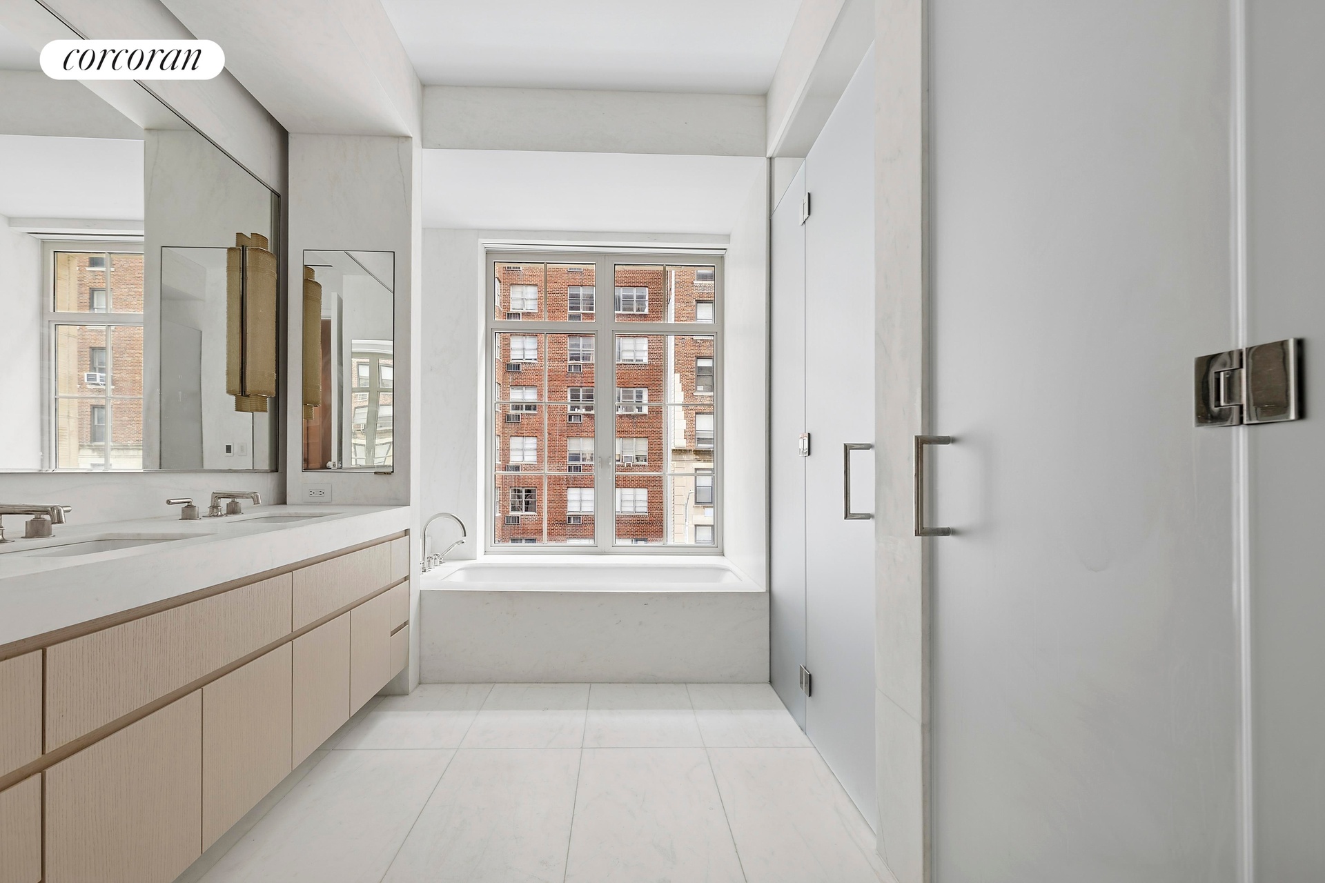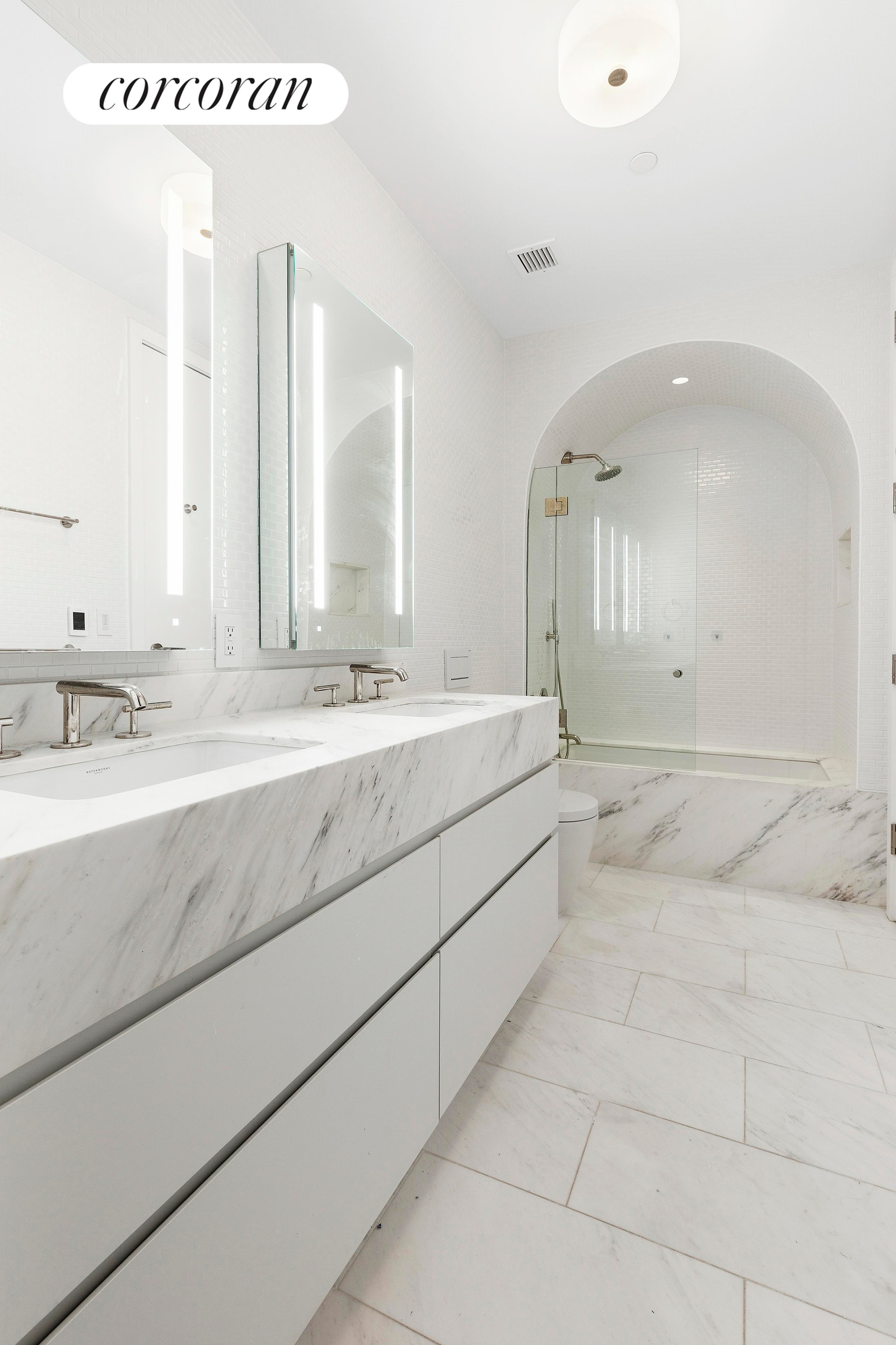 Two additional bedrooms share a spacious en-suite bath with Calacatta marble and Waterworks fixtures. A versatile fourth bedroom or library offers an en-suite bathroom and picturesque views of Madison Avenue. The powder room features honed Italian Burlesque marble and elegant brass accents.