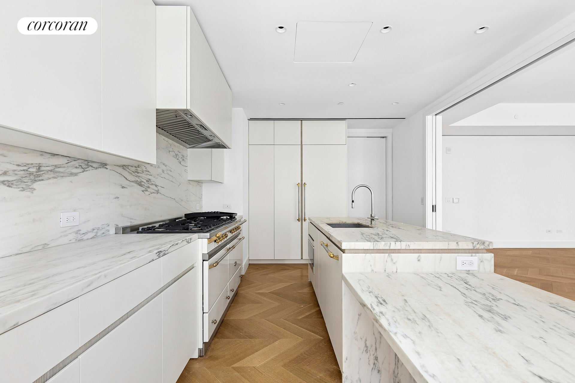The Molteni-designed eat-in kitchen is a culinary masterpiece, featuring matte white lacquer cabinetry accented with white oak, honed Calacatta Estremoz countertops, and a built-in breakfast counter. High-end appliances from Lacanche, Sub-Zero, Wolf, and Miele complete this chef's dream.