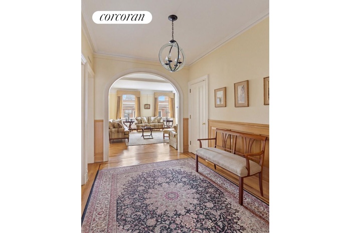 Enter through a semi-private elevator vestibule into a gracious center entrance gallery that leads to a nearly 20-foot-wide living room with southern exposure and open sky views over double-wide 86th Street. The formal dining room sits just off the gallery, creating a natural flow for entertaining.
