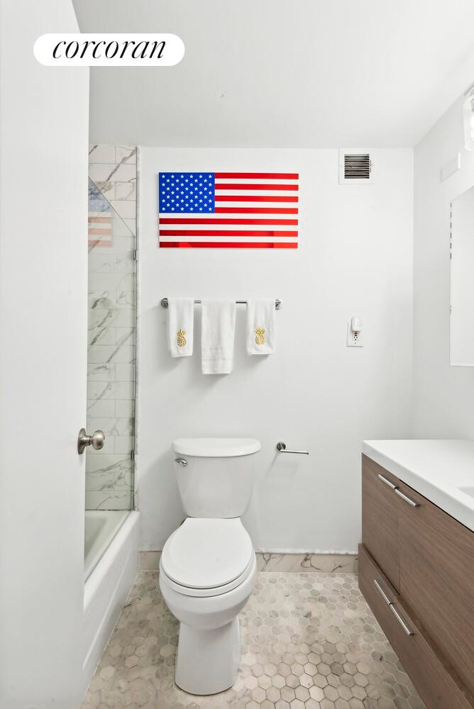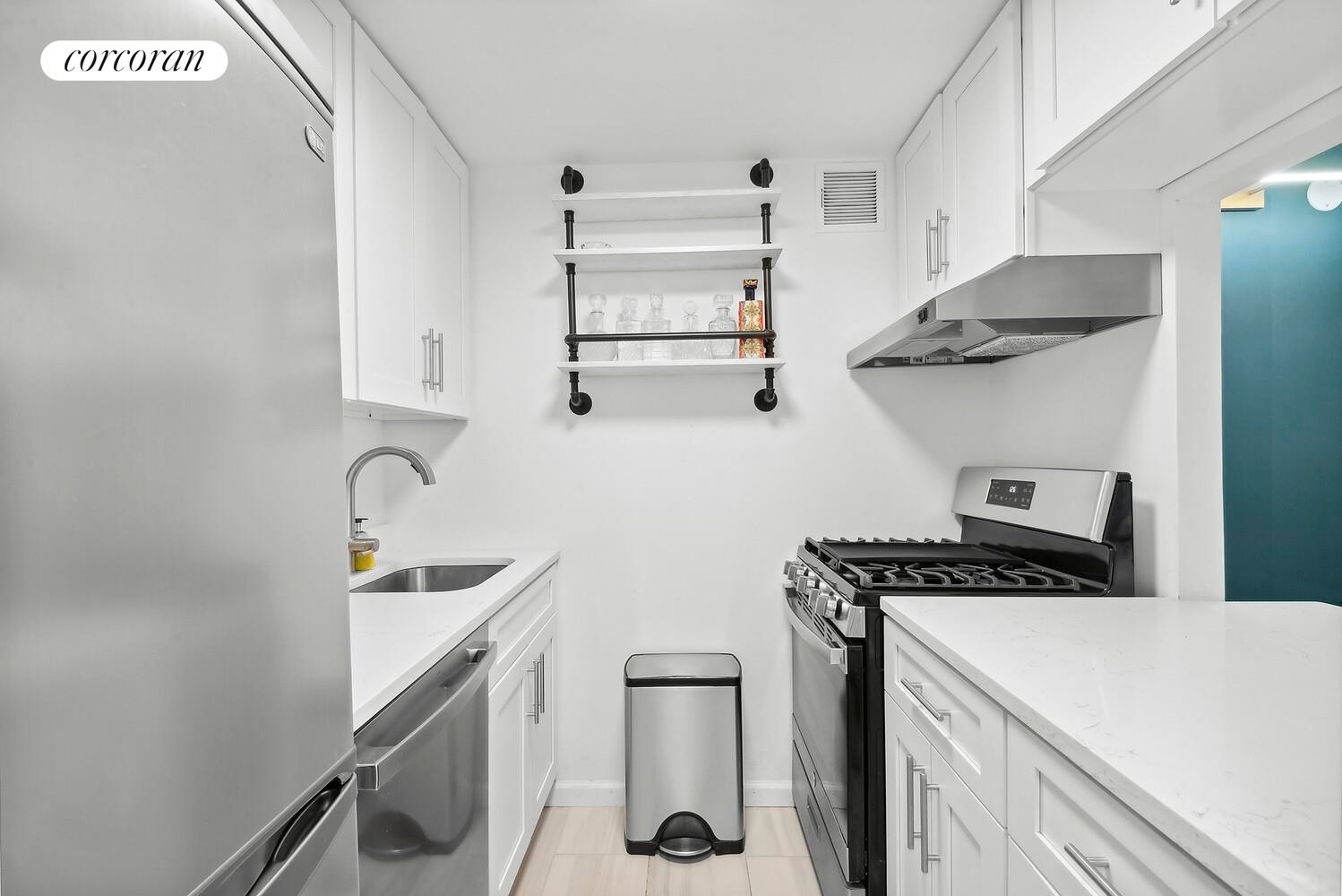 The newly renovated galley kitchen boasts new countertops and high-end appliances, including an LG refrigerator and GE Dry Boost dishwasher. The bathroom features all-new tiling, a rejuvenating rain shower, and a modern vanity. Beautiful brand-new wood floors adorn the living space, complemented by custom-built closets offering abundant storage.