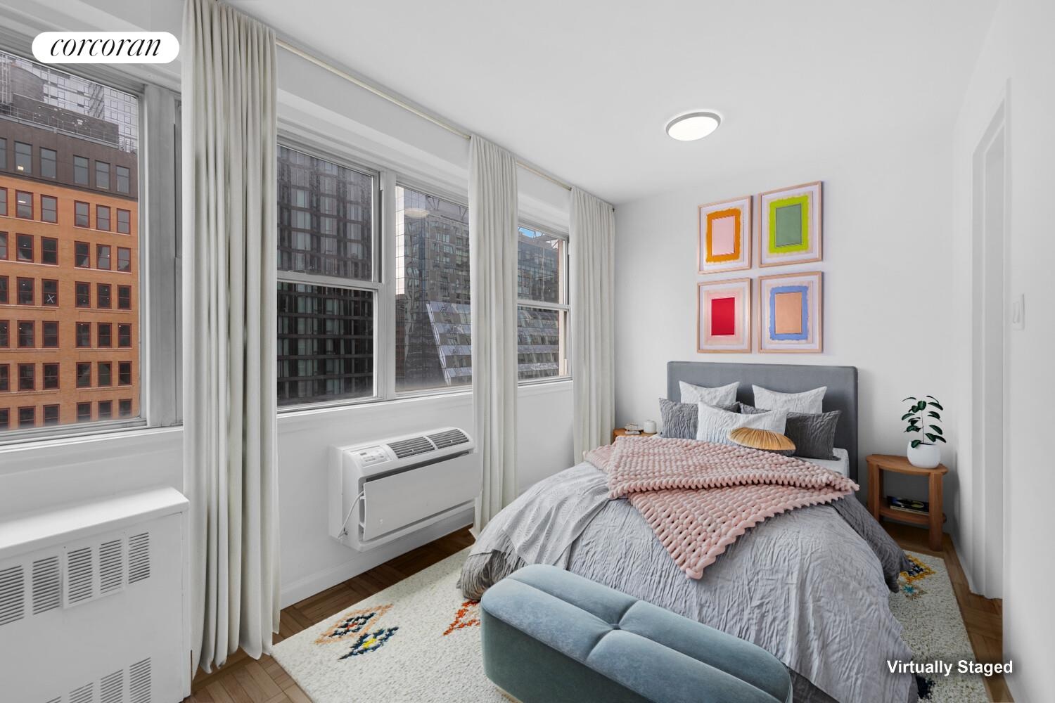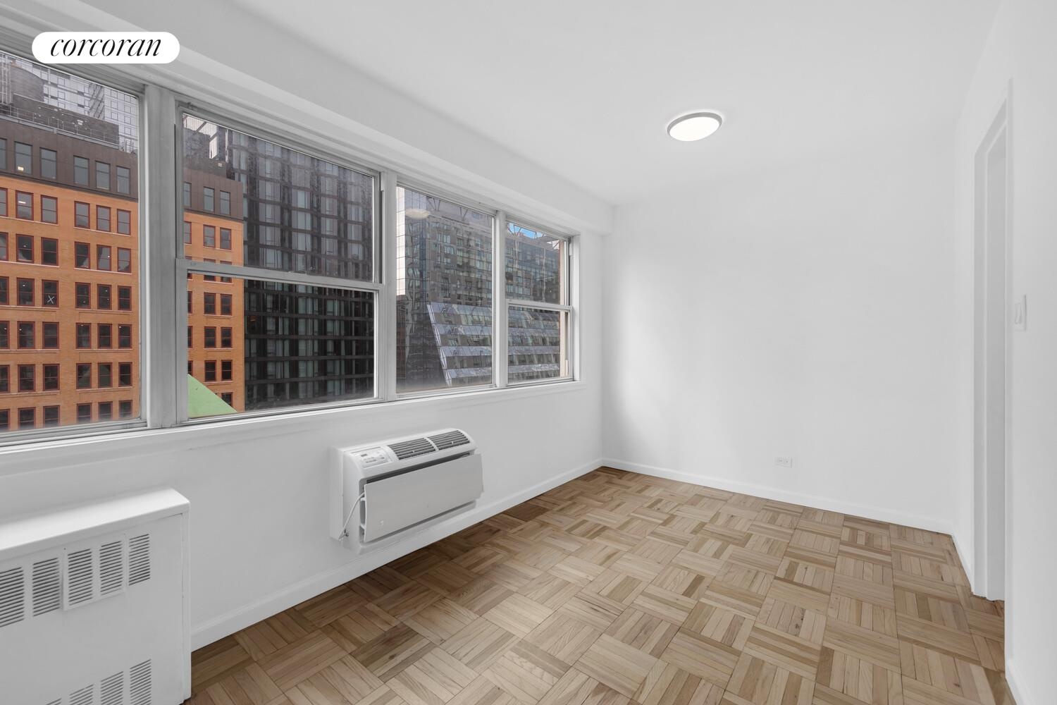 This bright, west-facing residence is bathed in warm afternoon light and features open sky and city views. Thoughtfully redesigned, the apartment showcases a brand-new kitchen and bathroom with modern finishes and sleek fixtures, complemented by hardwood floors throughout. The spacious alcove layout comfortably fits a queen-sized sleeping area and can easily function as a junior one-bedroom, creating a distinct separation between living and sleeping spaces. Generous closet space adds to the home's functionality.