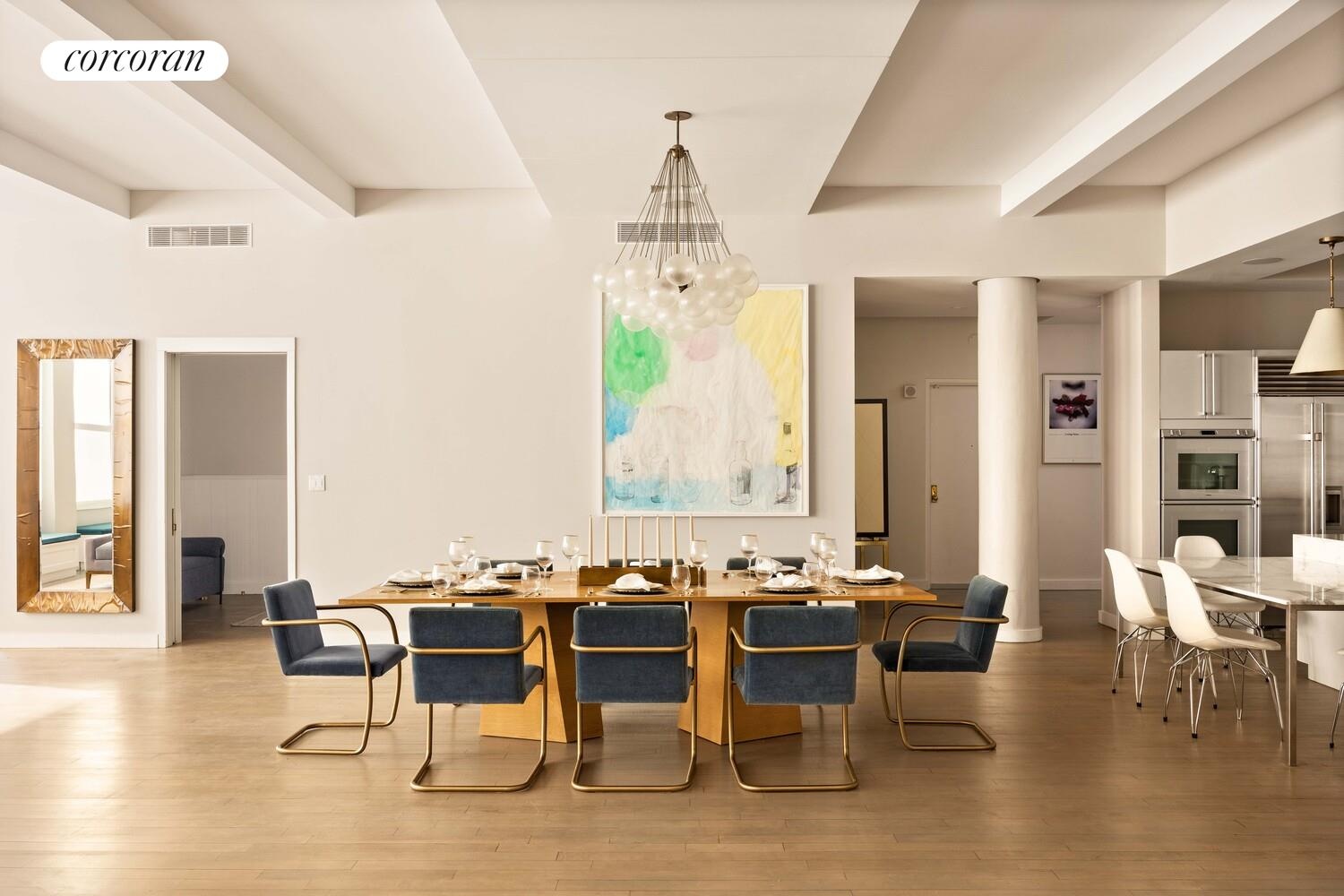 Arrive via key-locked elevator to your private landing-complete with an oversized closet-before stepping into a south-facing great room bathed in natural light. Spanning over 30' x 30', this expansive living space features soaring 11-foot ceilings, classic loft-style windows, and sleek white oak floors. With room for multiple seating areas and a dining table for 15+ guests, it's an entertainer's dream.