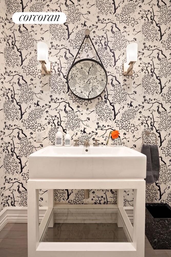 A wide hallway leads to the private quarters, passing a powder room, vented washer/dryer, and abundant storage. Thoughtfully configured with four bedrooms and three full baths, this wing offers both privacy and scale. The serene primary suite features two custom walk-in closets-one serving as a dressing room-and a luxurious five-fixture en-suite bath with a deep soaking tub, steam shower, dual vanities, and a separate water closet.