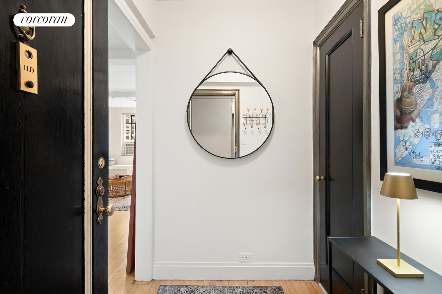 A gracious entry foyer welcomes you into a sunfilled living room framed by charming casement windows, with beamed ceilings and hardwood floor highlighting the apartment's timeless prewar character.