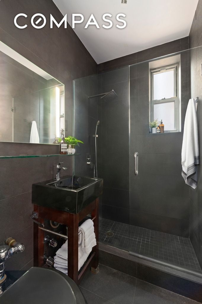 - Chic, windowed bathroom featuring a glass-enclosed shower and striking large-format charcoal tile.
