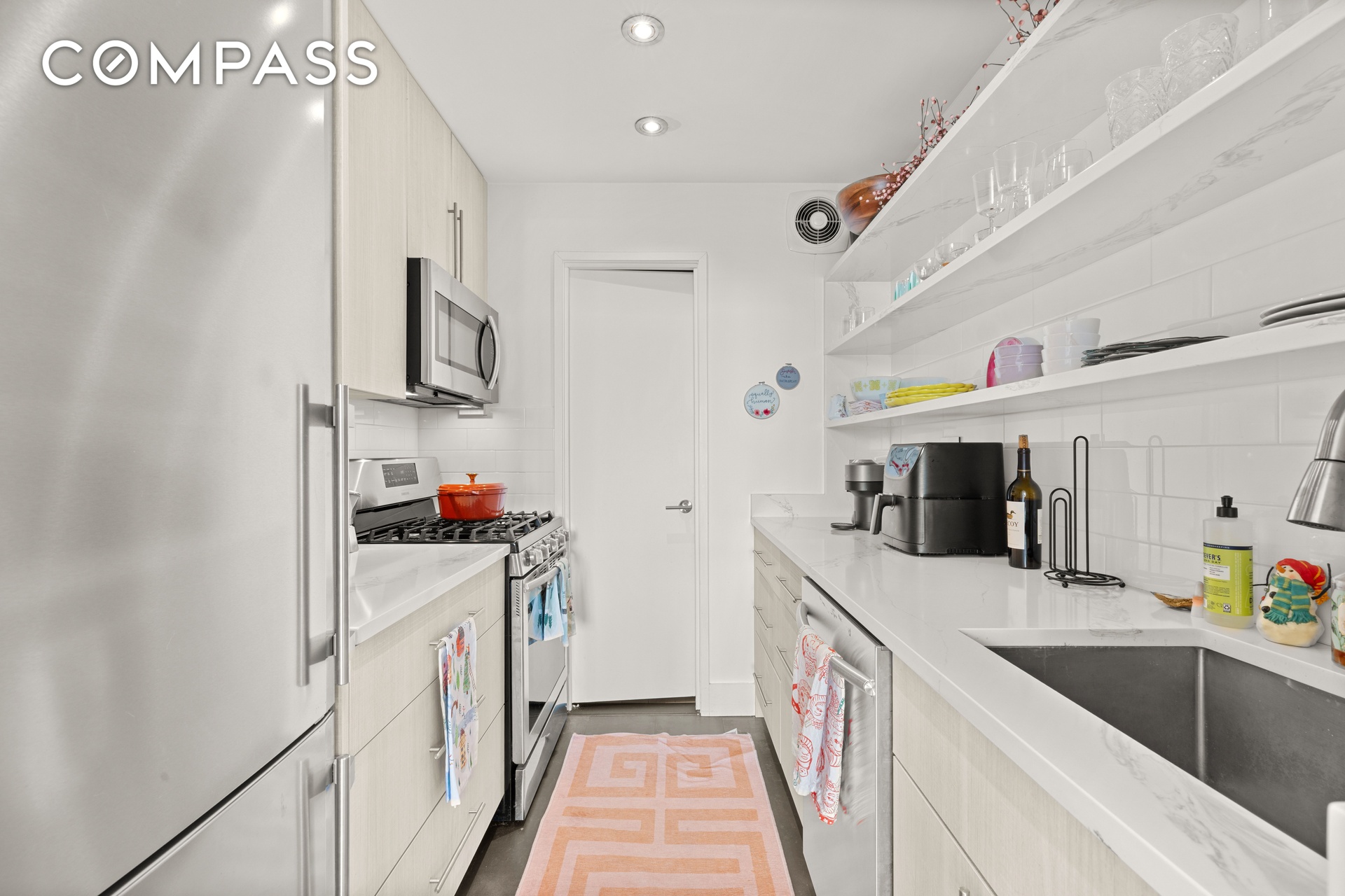 With soaring 12' ft beamed ceilings, the living / dining area is loft-like and expansive, leaving ample room for a home office should you require. The chef's kitchen has white lacquer European cabinets, caesar stone countertops, Wolfgang opera glass tile backsplash, pinin grey tiled flooring, GE Profile stainless steel stove and dishwasher and a Fisher & Paykel bottom. Just off the kitchen, there is a massive shelved walk in pantry measuring approximately 10' × 4", perfect for your storage needs.