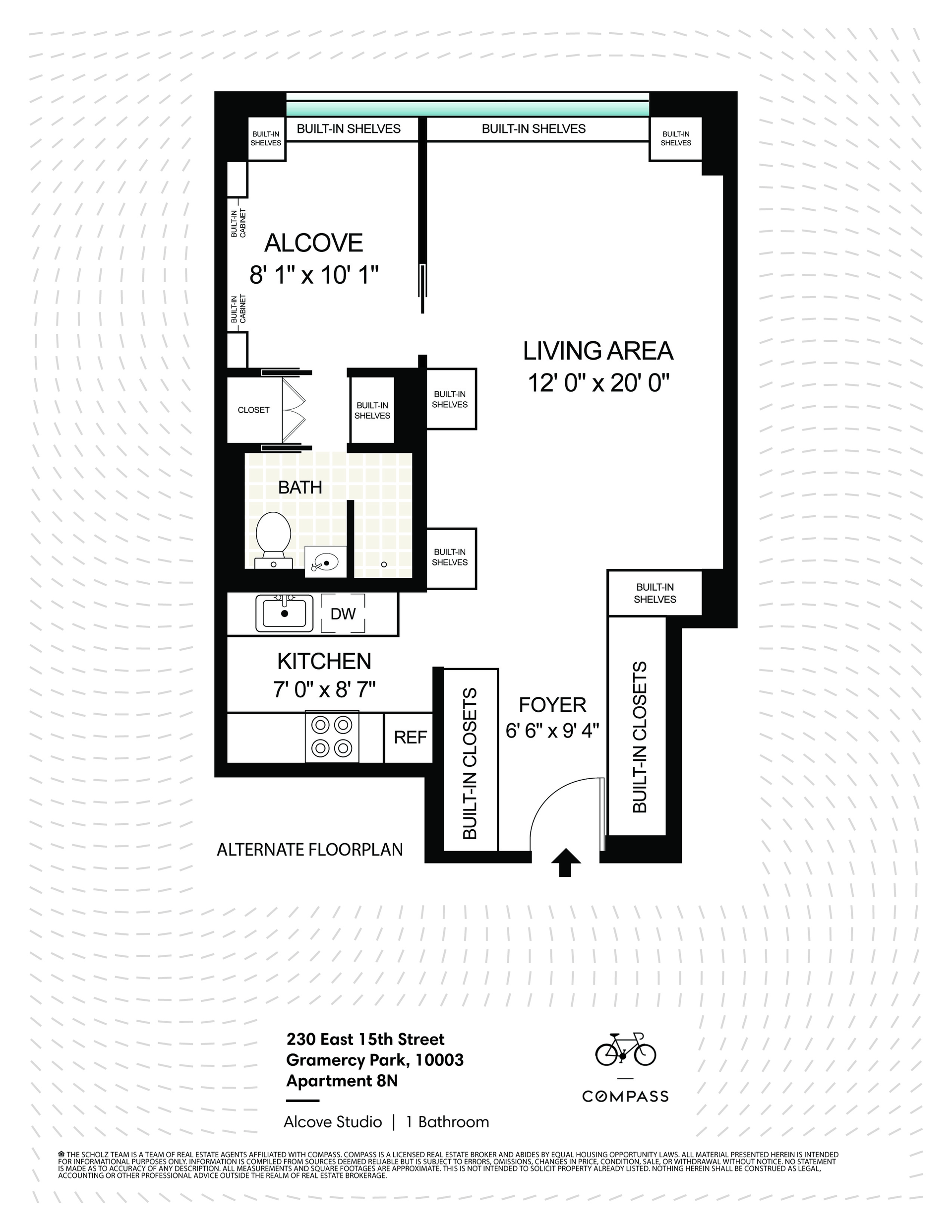 This spacious apartment features a renovated Kitchen with black granite countertops, modern white cabinets, and quality stainless steel appliances including a Dishwasher. With a walkway of deep closets as you enter, a closeted dressing area by the bathroom, and custom shelving thru the entire apartment there are ample storage options at your disposal. With over 500 sqft you can easily accommodate a dining area, a living room area, and a queen-sized bed in your alcove.