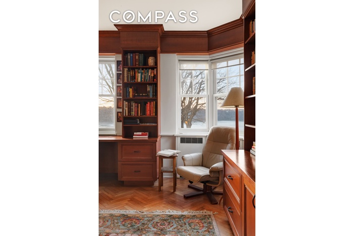 The master suite faces directly west over the Hudson River and has been renovated with his and her custom walk-in closets and luxurious bathroom. Sliding doors connect to the adjacent library/study, with custom built-in bookcases, desks and reading nook, ideal for a professional couple. This space could be converted to an additional bedroom, if needed. (See alternate floor plan 1)