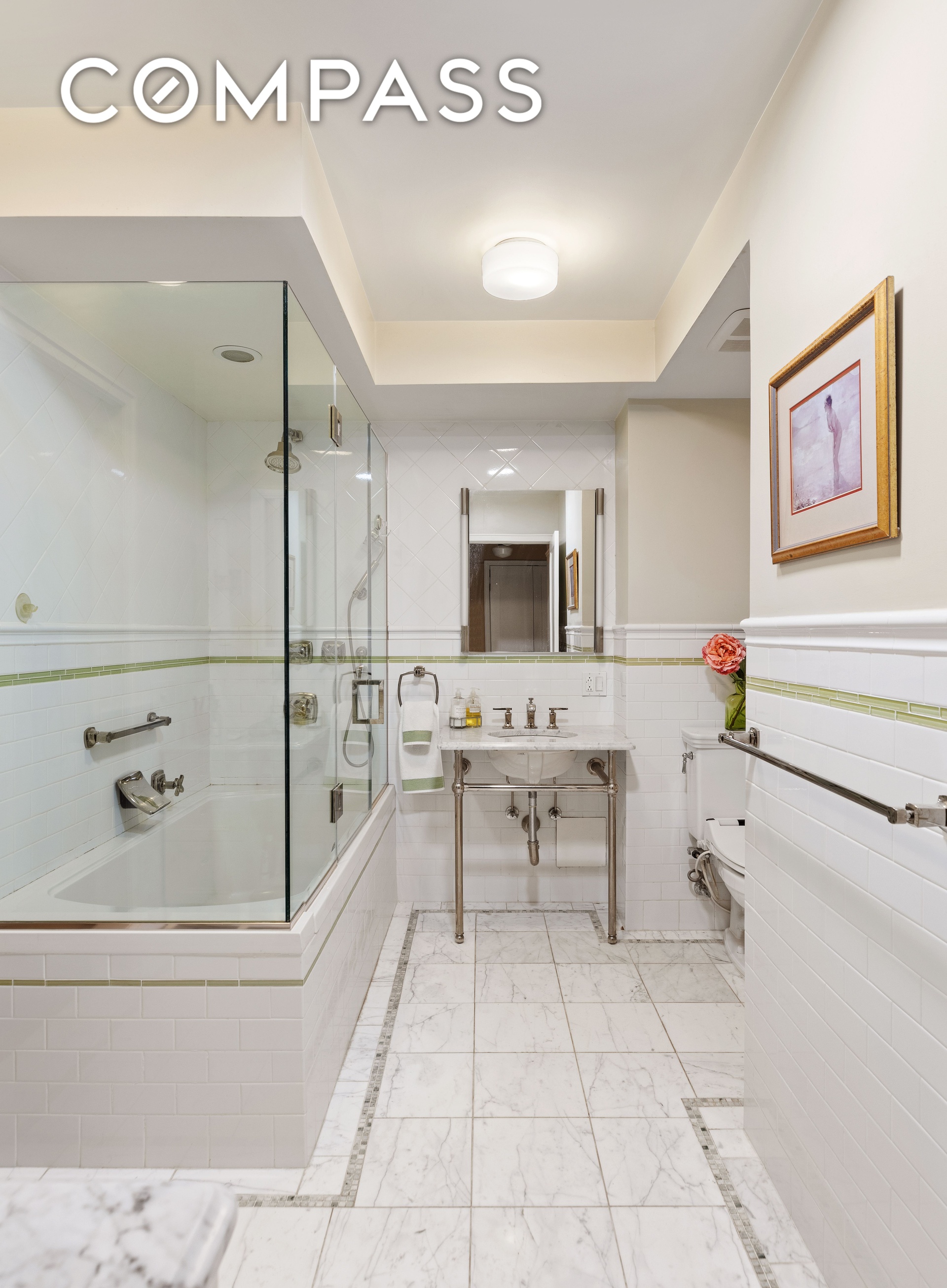 A second bedroom, with ensuite bath, occupies its own private wing, also with direct garden, bridge and river views. An additional third bedroom is located off the foyer with open views of Castle Village gardens. As an added bonus and rare treat in Manhattan, see the pantry and private laundry (Bosch Washer and Dryer), also off the foyer. (See alternate floor plan 2 for a re-dividing of this space to create a larger 3rd/4th bedroom, if needed.) High ceilings & picture rails, and oak hardwood floors.